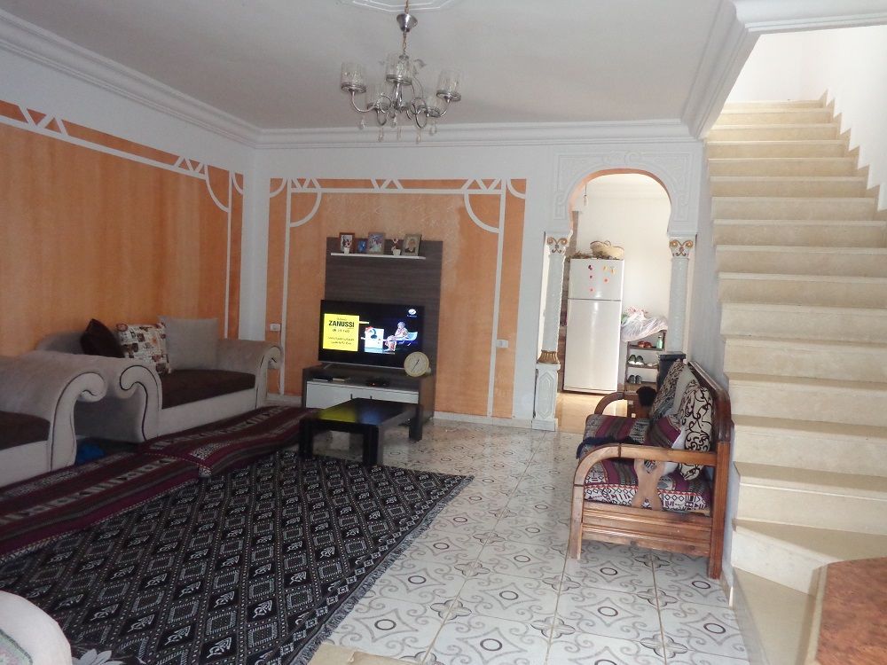 Avec l’agence immobilière ghalleb vous avez la chance d’avoir une maison style duplexe à jabnoun à 2 pas à jinen hammamet se compose d’un salon et trois chambres à couchers et deux salles d’eau a un terrasse avec un abri de voiture
