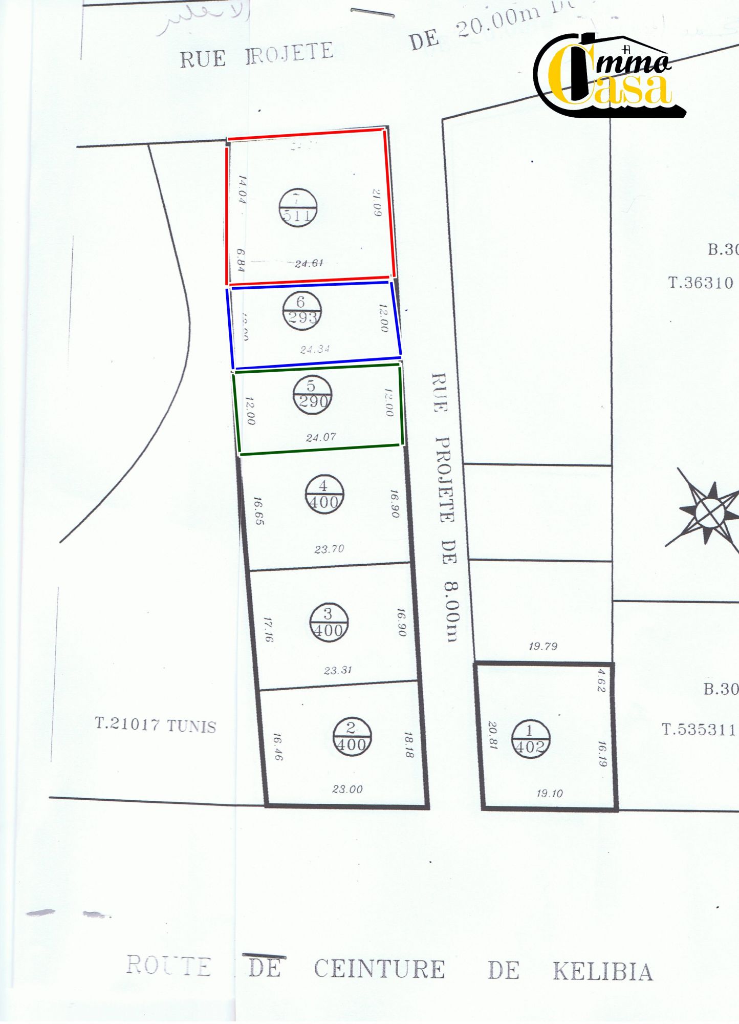 IMMO CASA vous propose à la vente trois lots de terrain situés à la proximité de 50 m de la route de ceinture contenant l’électricité , et portant l’approbation de la révision du plan d'aménagement urbain de la commune de Kélibia.