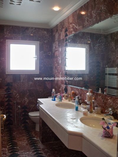 A vendre une belle demeure érigée sur deux niveaux, au style arabesque modernisé et avec une belle vue sur mer. Située à Hammamet Nord au niveau de la zone touristique et à environ 150m de la plage. Elle offre au rez de chaussée un double salon, un séjour, une cuisine moderne bien aménagée et une salle d’eau. Quand à l’étage, il offre une suite parentale (avec une salle de bain), trois chambres à coucher et une salle de bain. La villa dispose d’un sous sol qui compte deux chambres, une cuisine, une salle d’eau et un espace de jeu. La propriété est équipée de chauffage central et de climatisation et elle dispose d’un garage, d’une loge gardien, d'une douche extérieur, d’un spacieux jardin gazonnée avec une belle terrasse en cabane et d’une piscine.
