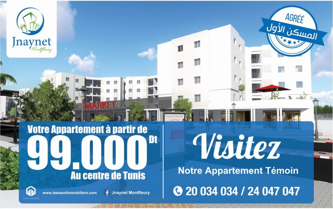 Jnaynet Montfleury, nouveau concept de cité intégrée situé à 10mn du centre ville Tunis vous offre à la fois votre logement ainsi qu'un ensemble de commodités : un marché, des commerces, une pharmacie, un centre médical, une mosquée, protection civile, une maison de jeunes, des terrains de sport, une école, un jardin d'enfant, des espaces verts et des bureaux... Caractéristiques techniques: -résidence sécurisé en R+4 -Parking sous sol et aérien -Ascenseurs -Chauffage central pré installé --Gaz de ville -Revêtement en marbre dans les salons et les couloirs -Revêtement en grès cérame et faïence -Menuiserie en Aluminium avec volet roulant -Menuiserie en bois rouge Pour Plus d'infos contacter : 20 034 034