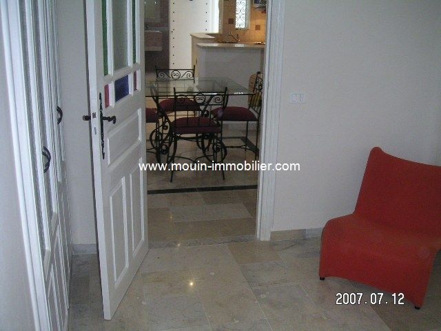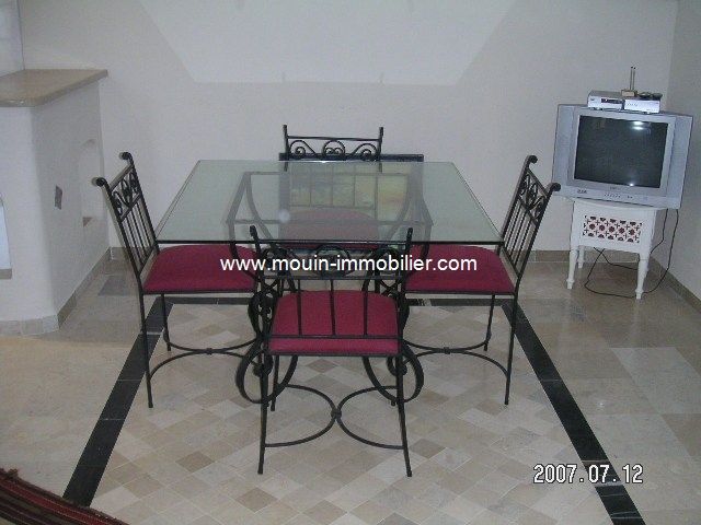 A louer à l'année un bel appartement meublé avec gout, situé dans le centre villa de Hammamet à deux pas d e la plage. L'appartement est composé d'un salon salle à manger, une cuisine américaine, deux chambres à coucher et une salle de bain. Il est équipé de chauffage central et de la climatisation. Prix : 700 DT/mois