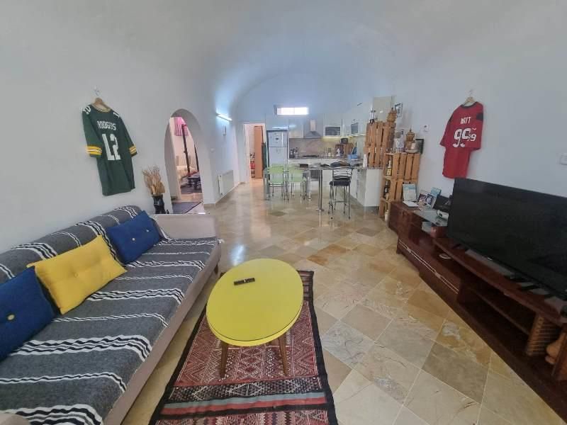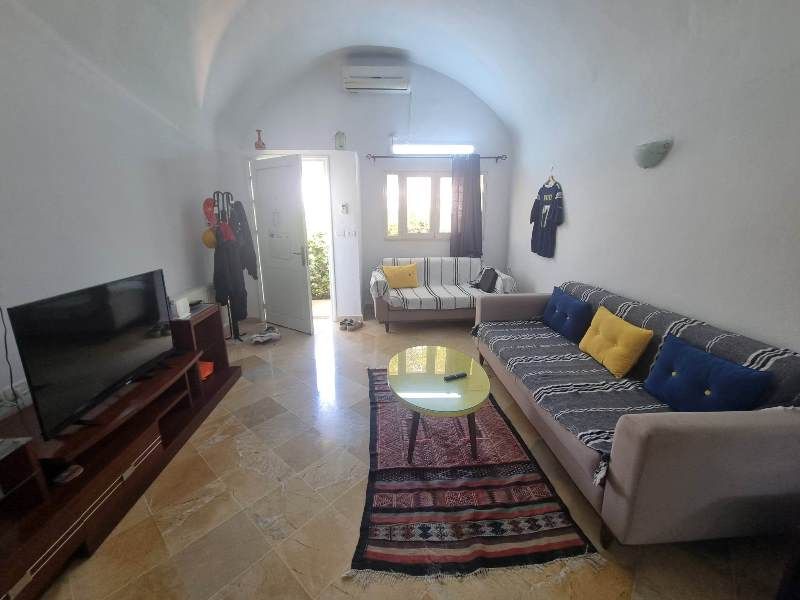 A louer à courte durée chez l'agence TPS IMMOBILIERE Hammamet, un joli appartement au RDC de type s+2 d’un style mélangé entre une architecture typique et contemporaine, des voûtes au plafond et marbre par terre.