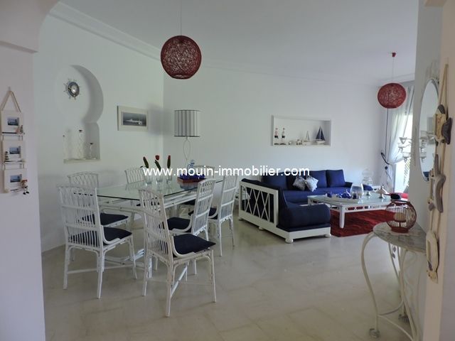 A louer pour les vacances un bel appartement richement meublé situé au rez-de-chaussée d'une résidence pied dans l'eau à Hammamet. II se compose d'un salon-salle à manger donnant sur une belle terrasse et le jardin, une cuisine équipée, deux chambres à coucher et une salle de bain. L'appartement est équipé de la climatisation et il dispose d'un beau jardin et d'un parking.