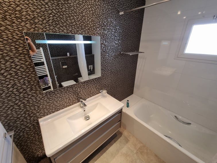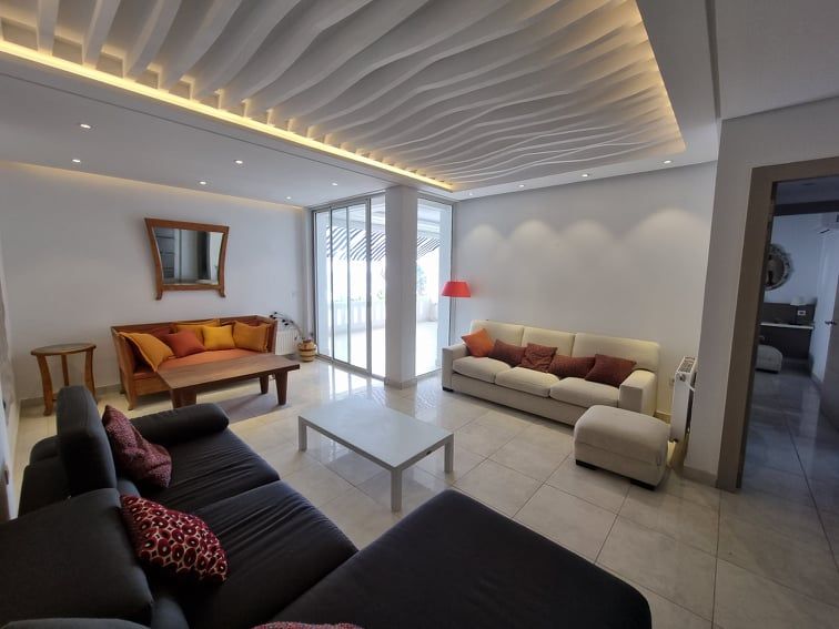 Cet appartement comporte un salon avec une terrasse vue sur mer, une cuisine équipée, trois chambres à coucher et deux salles de bains une avec une douche et l’autre avec une baignoire.