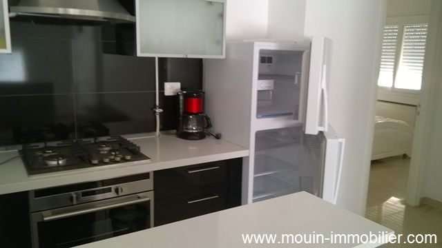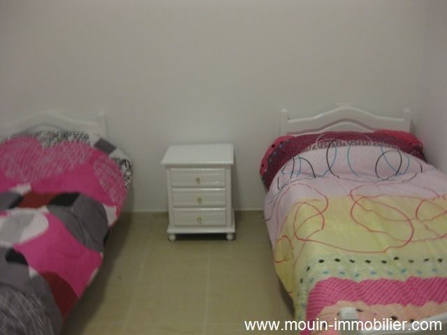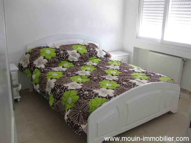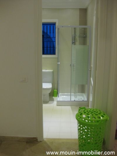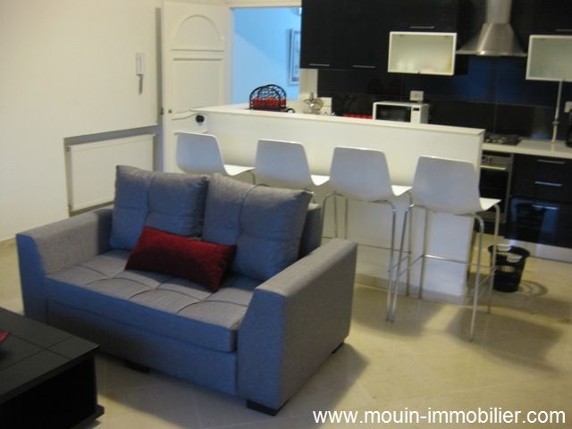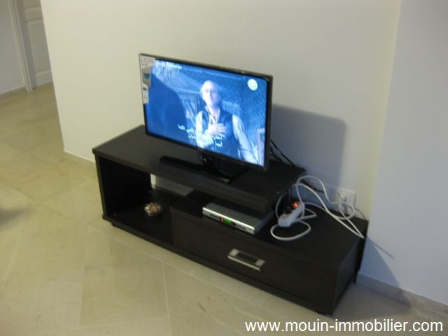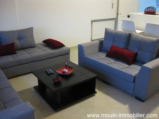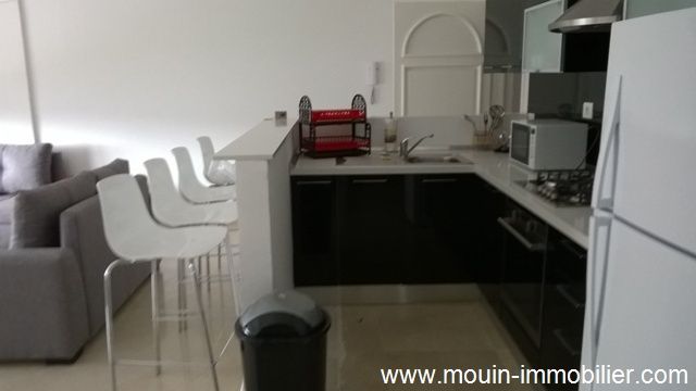 A louer à l'année un appartement d’haut standing sis au 1er étage d’un petit immeuble privé de type R+2 se trouvant dans un lotissement de villas, en plein coeur de Hammamet Sud. Il offre un spacieux salon, une cuisine américaine bien équipée, deux chambres à coucher et une salle de bain. Il est équipé de chauffage central et de climatisation (au salon). Prix : 1000 DT/mois