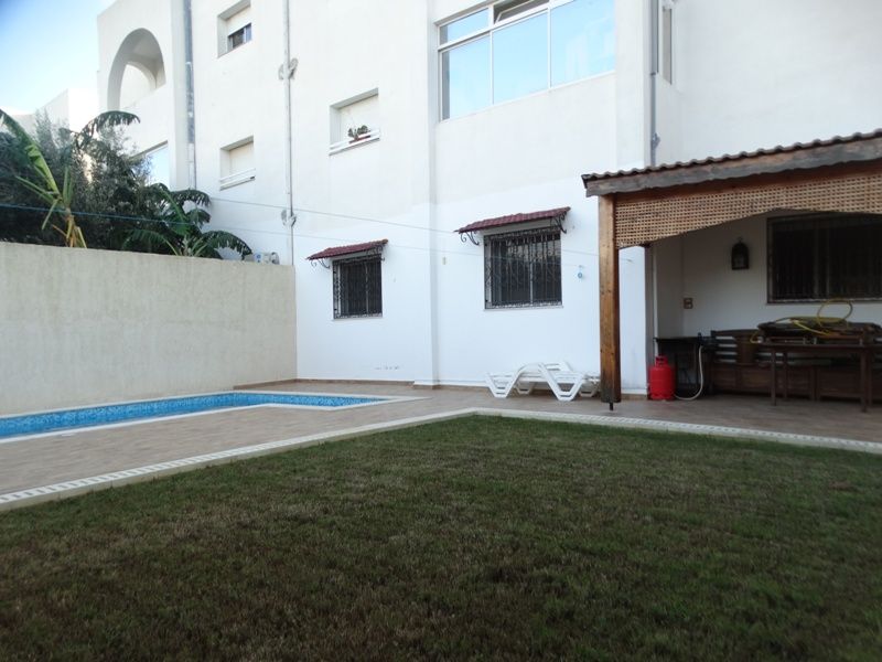 L’appartement comporte une suite parentale, deux chambres à coucher, une salle de bain, une belle cuisine moderne avec un séchoir, un salon avec une belle terrasse, un joli jardin gazonné orné d’un bassin et belle piscine.