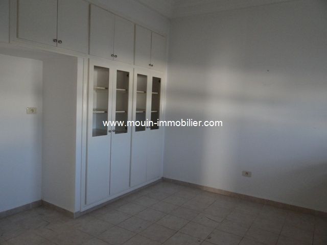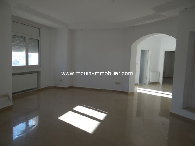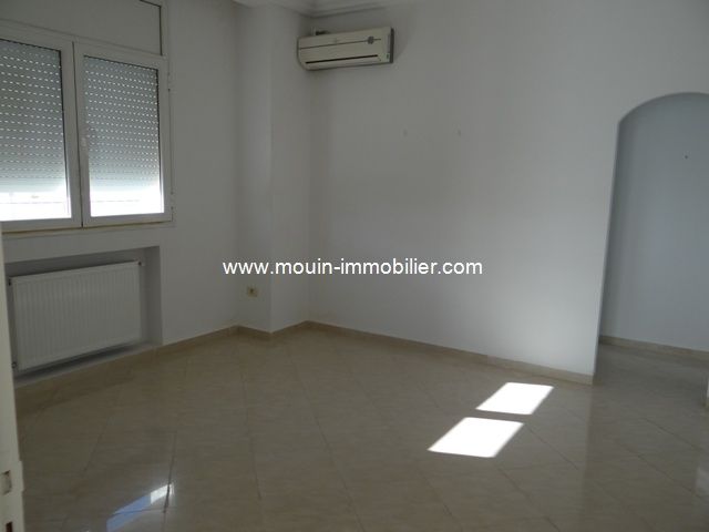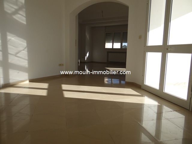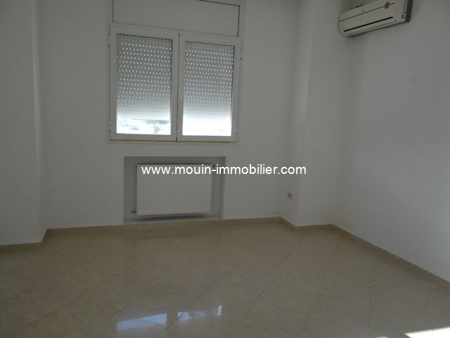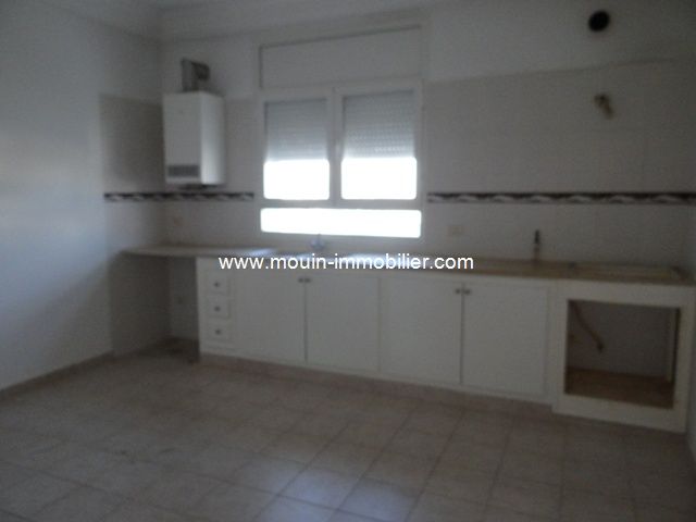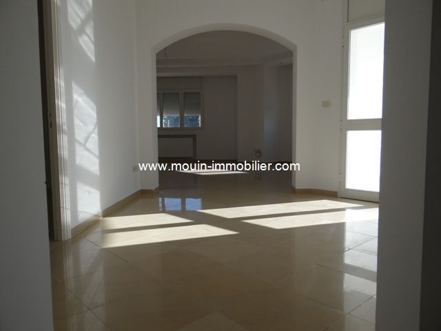 A louer à l'année un bel appartement non meublé, spacieux et lumineux situé à l'étage d'un petit immeuble proche commerces. Il est composé d'un hall d'entrée, un salon salle à manger donnant sur une terrasse, une cuisine aménagée, une suite avec une salle d'eau, deux chambres et une salle de bain. L'appartement este équipé de chauffage central et il dispose de la climatisation au salon et dans la suite. Location avec parking sous sol : 800Dt /mois