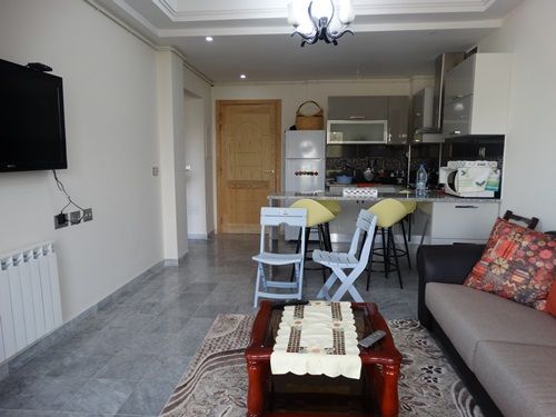L'appartement comporte un salon , une chambre à coucher,une suites parentale, une salle de bain et une cuisine américaine équipée avec un séchoir.