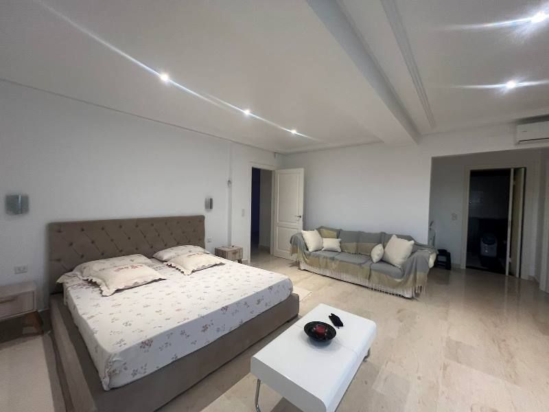 Arrivant au 2ème étage, on trouve un grand salon de style arabesque avec des bais vitrée donnant sur une belle terrasse avec une imprenable vue sur la mer.