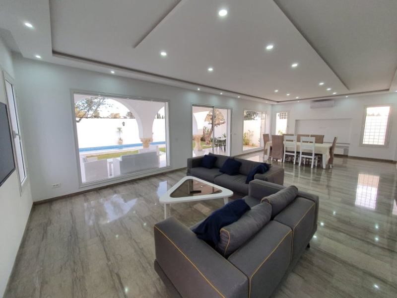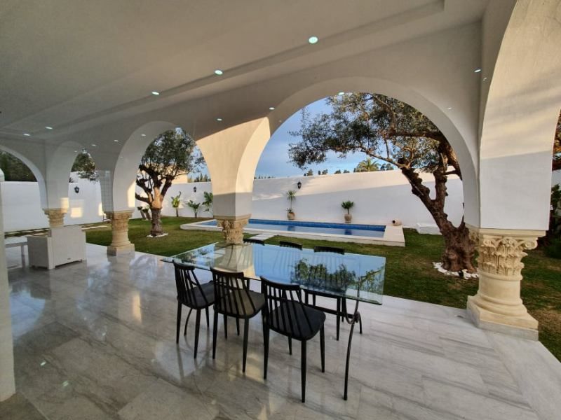 A louer pour les vacances chez l'agence TPS Immobilière Hammamet, une magnifique villa toute neuve alliant le style moderne avec le style arabesque avec des arcades et la belle architecture.