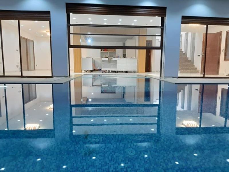 Au RDC on trouve un salon ouvert sur la cuisine et piscine chauffante et une salle d'eau