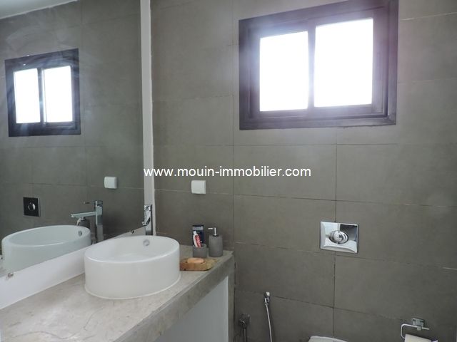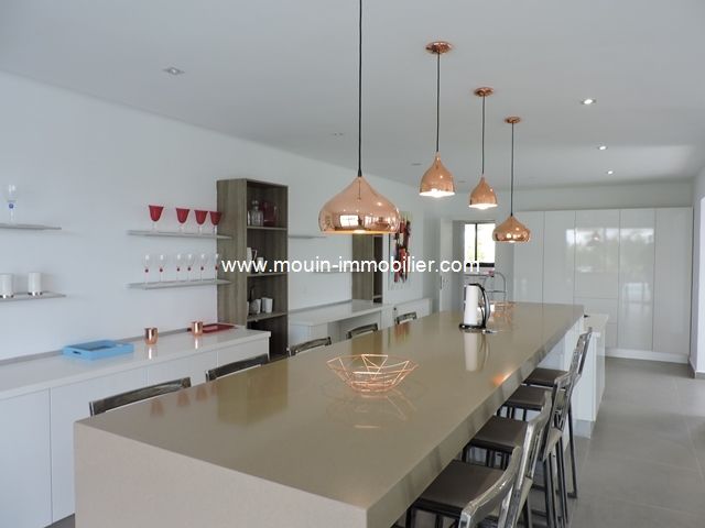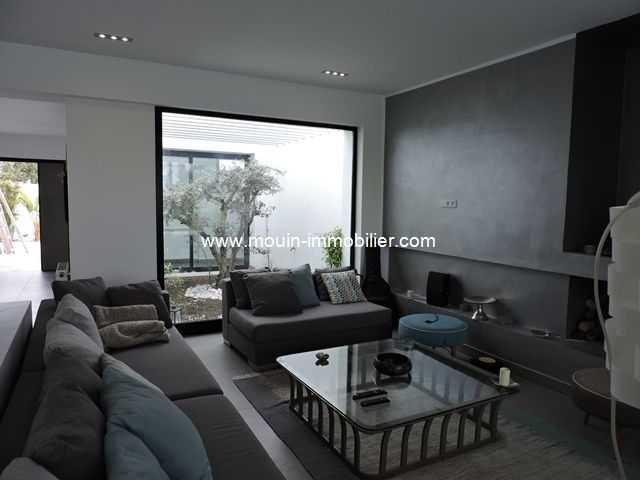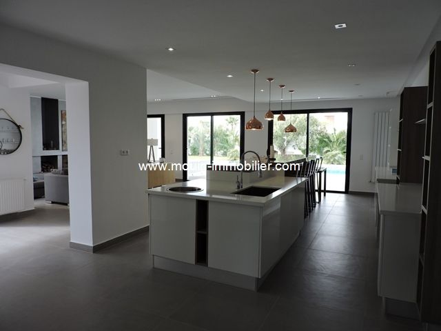 Sur un terrain de 1500m2 et une surface bâtie de 480m2, disponible à la location estivale une luxueuse demeure de plain pied, richement meublée, située dans un cadre verdoyant et serein à Hammamet. Elle se compose d’un hall d’entrée, un beau salon avec une cheminée et wifi desservant toute la villa, une salle à manger ouvrant sur un beau jardin et la piscine, un vaste jardin d’hiver, une cuisine bien équipée, une salle d’eau visiteurs, quatre suites chacune avec un dressing et salle d’eau dont la suite parentale avec un très grand dressing et salle de bain avec douche et double lavabo.