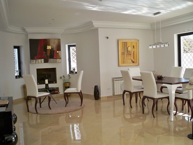 A vendre une belle demeure érigée sur deux niveaux sise à Hammamet. Le RDC se compose d'un salon avec une cheminée fonctionnelle, une chambre à coucher, une salle d’eau et une cuisine moderne bien équipée. L'étage compte une chambre à coucher et une suite parentale avec une salle de bain. La propriété possède une grande terrasse qui s'ouvre au jardin entourant une belle piscine et une loge gardien. La villa est équipée de climatiseur et du chauffage central.