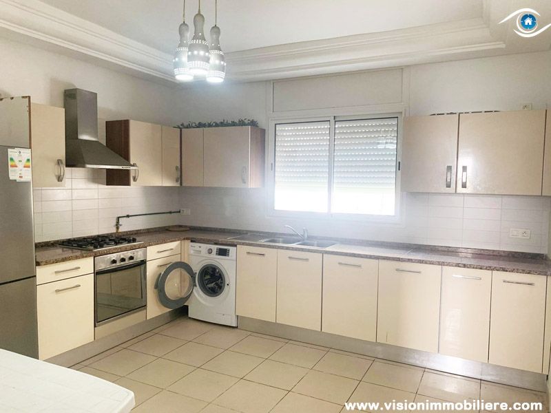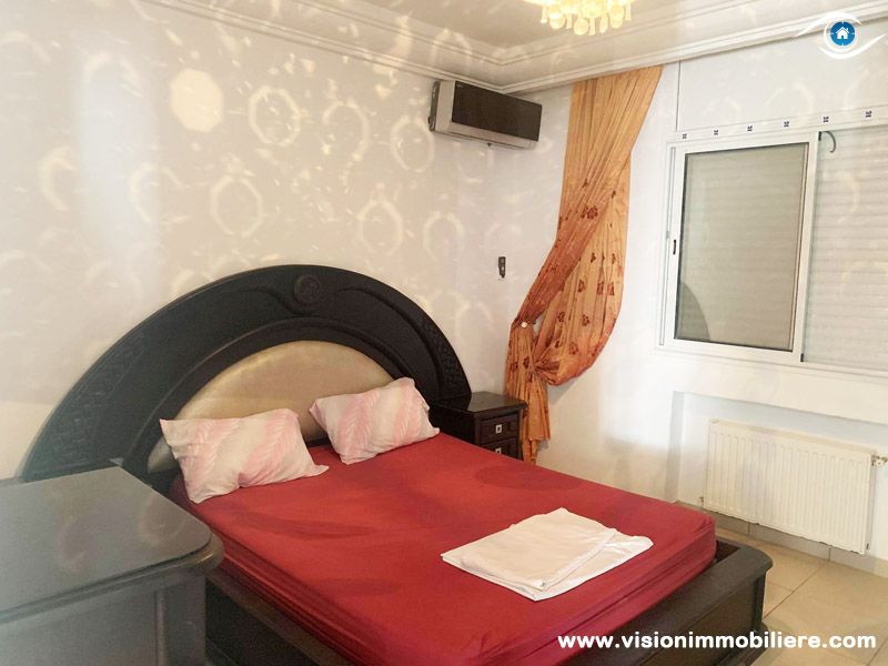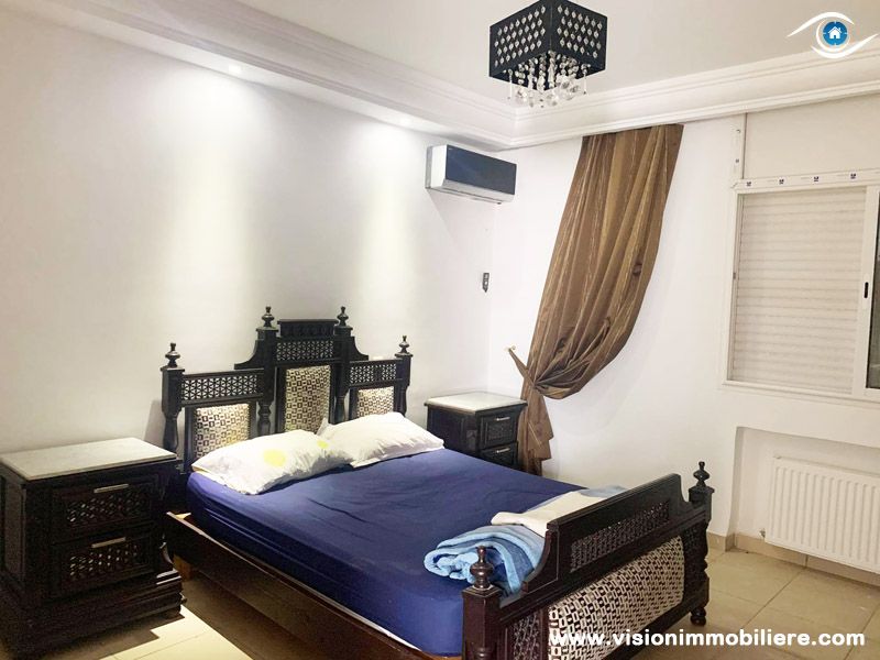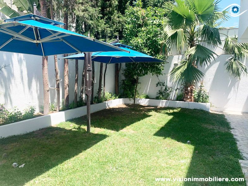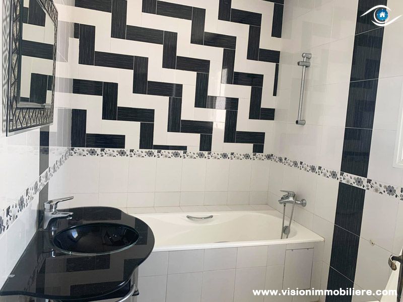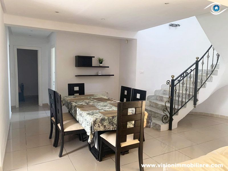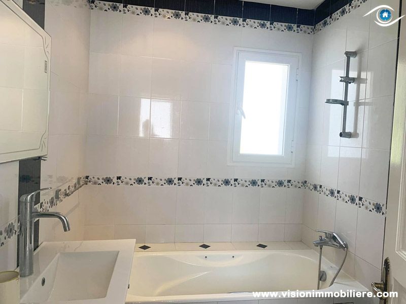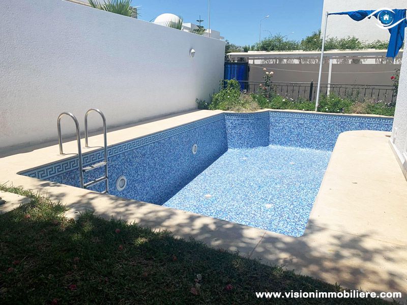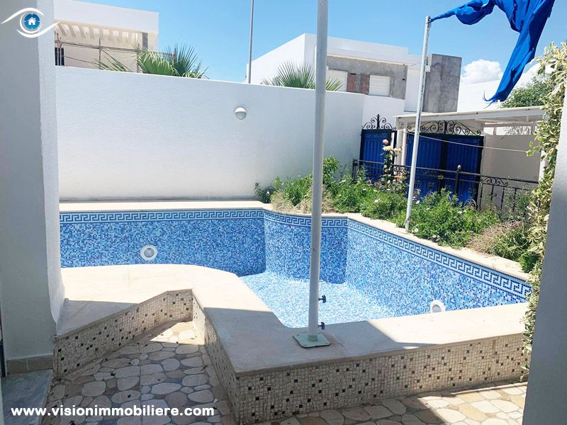 A louer , Pour les Vacances , chez vision immobilière Hammamet-tunisie ; cette villa au style moderne se situe à Hammamet-Sud . Une villa luxueuse avec une qualité de vie élevée ; L'entrée ouvre sur un jardin enveloppant paysagé et orné d'une piscine . La partie jour est composée de deux salons et une salle à manger , une salle de bain pour les invités . une cuisine moderne bien équipée de rangements fonctionnels . Le 1er étage mène à la partie nuit qui dispose trois chambres à coucher meublée par des dressings et une suite parentale .Elles partagent une salle de bain commune. La villa est entièrement équipée de chauffage central et de climatisations.un abri qui peut contenir deux voitures.