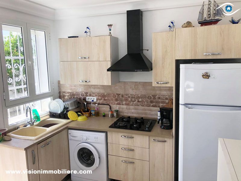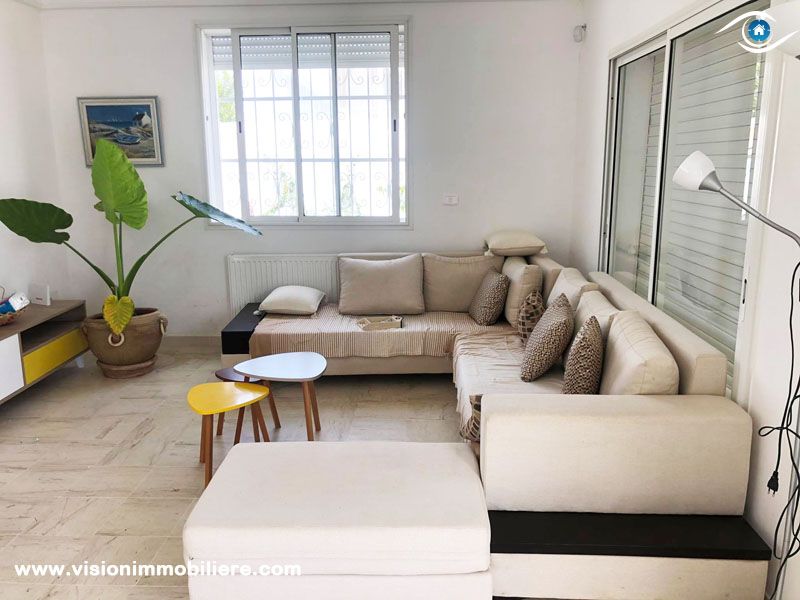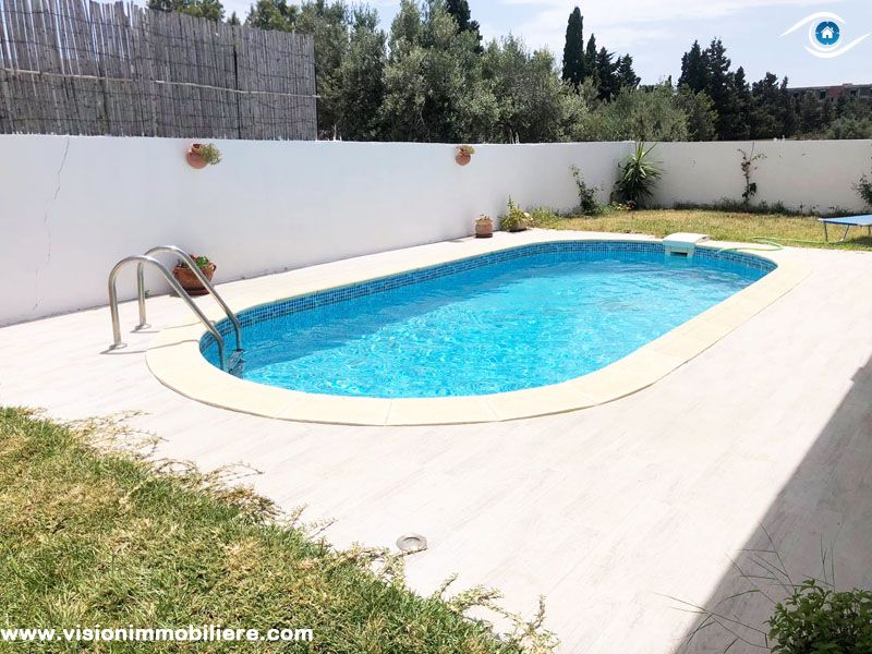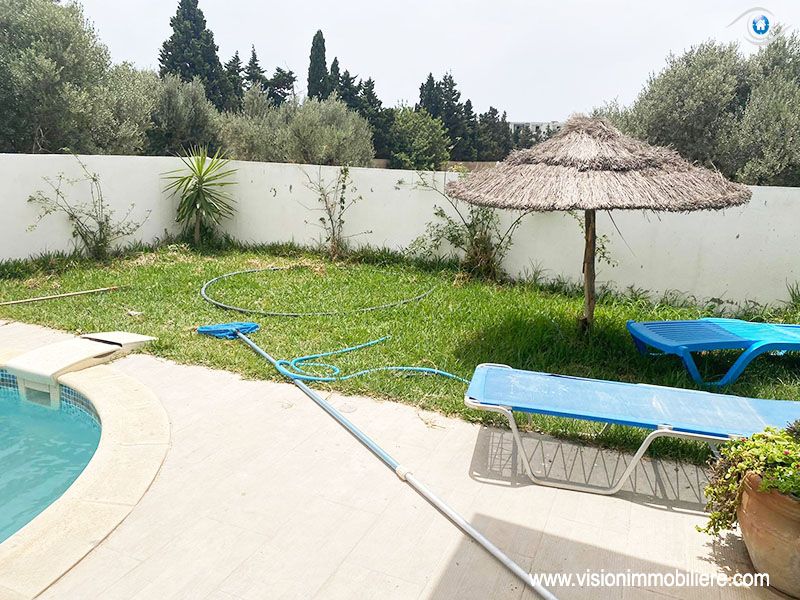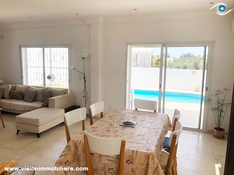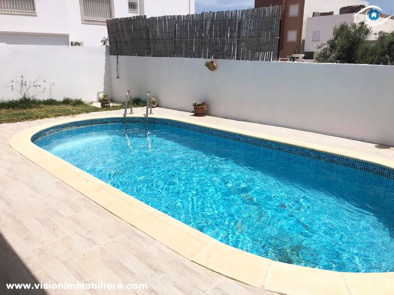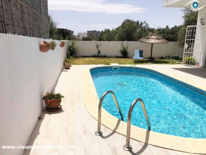 A louer , Chez Vision Immobiliére Tunisie Hammamet ,une villa qui se situe à Hammamet Nord , elle se distingue par son style moderne , elle se bénéficie d'un jardin gazonné qui offre plusieurs espaces de détente dispose d’une piscine. L'entrée ouvre sur un salon et une salle à manger spacieux et lumineux ,qui s'ouvre sur un terrasse , fournit un espace de vie et offre une vue dégagée sur le jardin et la piscine grâce ses grandes ouvertures La cuisine dispose de plusieurs éléments de rangement . deux chambres à coucher avec dressing et une salle d’eau pour les invitées compléte la partie jour. au 1 er étage on trouve deux chambres avec terrasse , une chambre individuelle et un terrasse . un garage qui peut contenir un voiture .