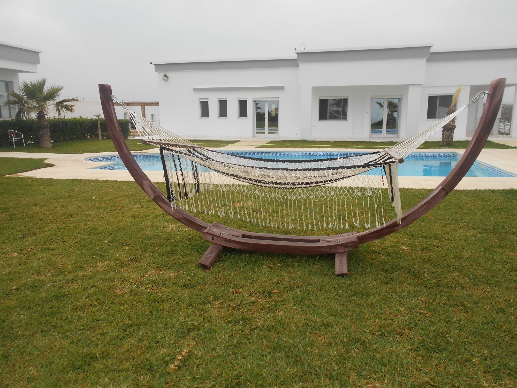 A l’extérieur une grande piscine construite au milieu d’une propriété de 3000m et vaste une superficie de terrain dont une partie est gazonné et le reste dispose d’une végétation d’arbre fruité