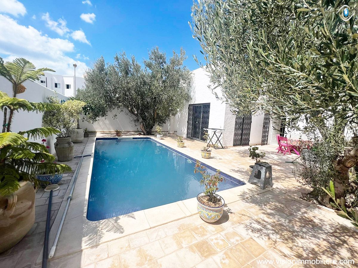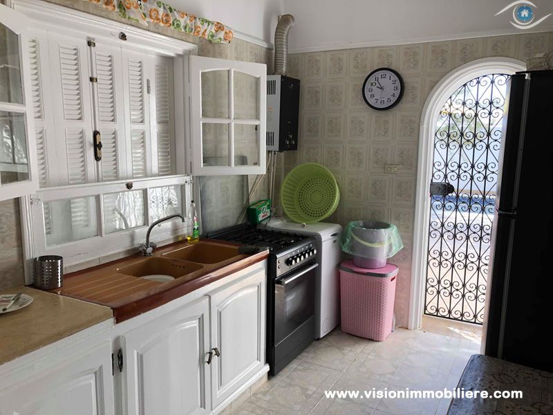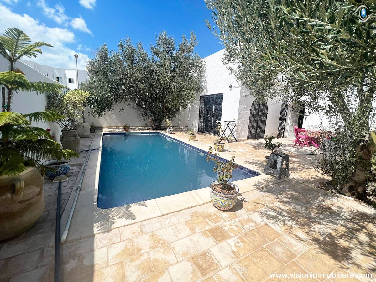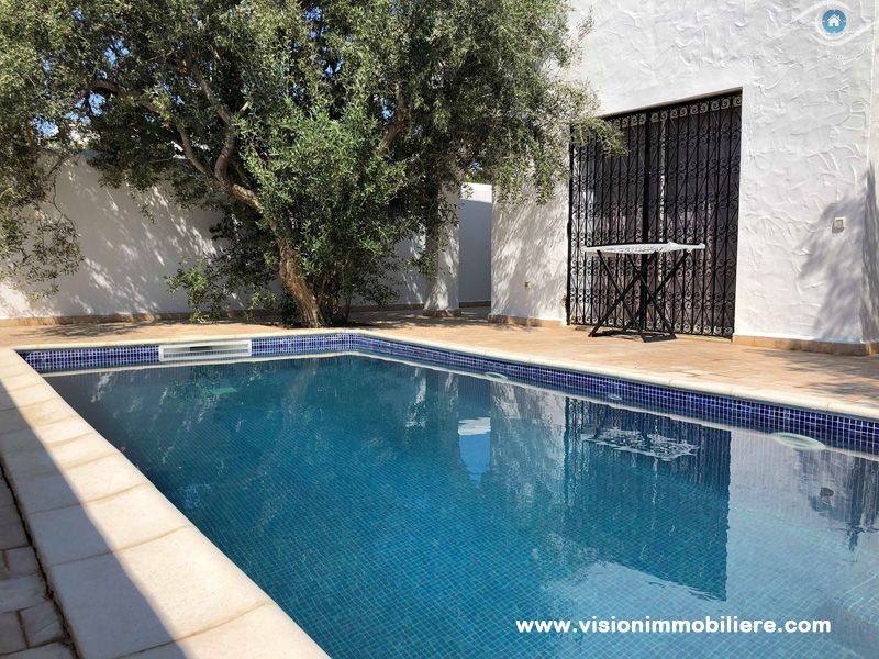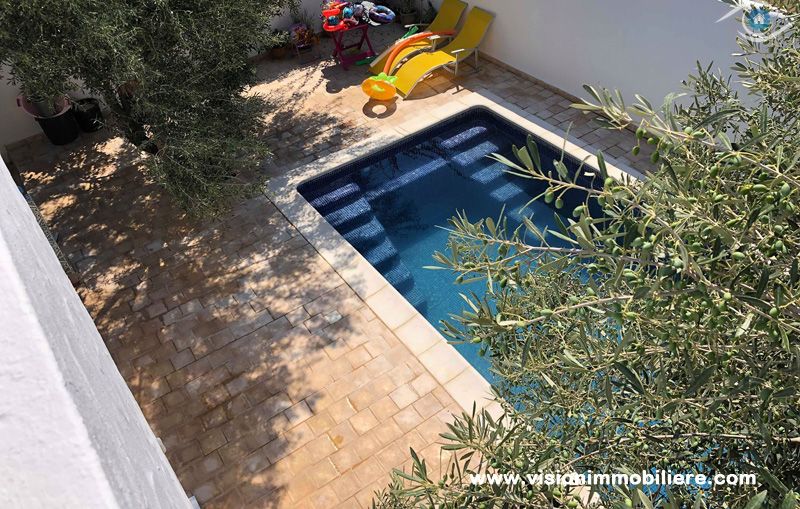 A vendre chez vision immobilière Hammamet-Tunisie ; une villa situé à Hammamet–Nord à 5 minutes de la mer. L’entrée donne sur un jardin et une piscine. La partie jour se compose d’un salon, un sale à manger, une cuisine aménagée et agencée par les éléments de rangement nécessaire, une salle d'eau et salle de bain commune complété la partie jour. La partie nuit dispose de 3 chambres à coucher meublées par dressings. La villa est entièrement équipée par un système de climatisations. Un abri et un garage qui peuvent contenir 2 voitures.