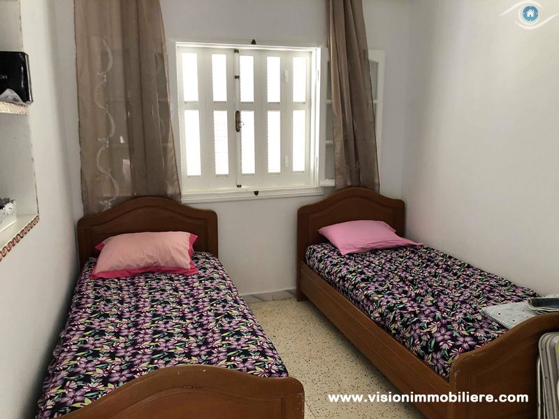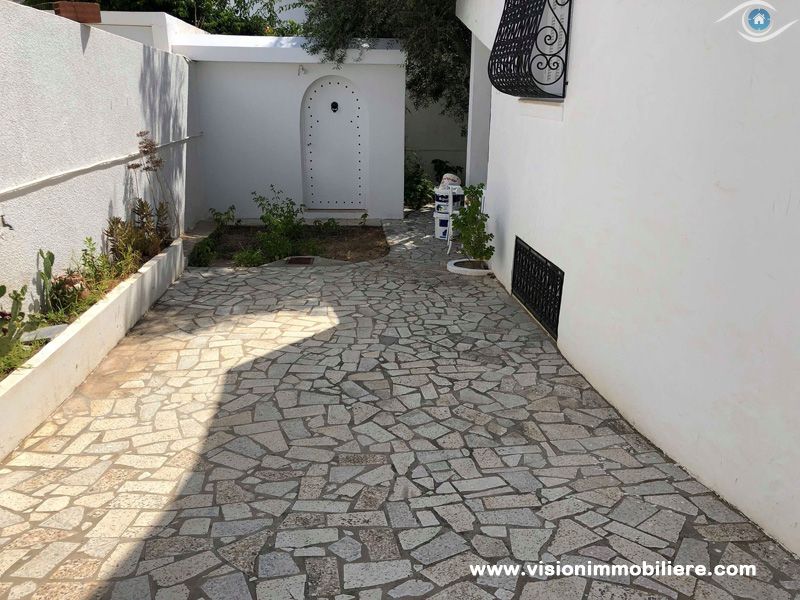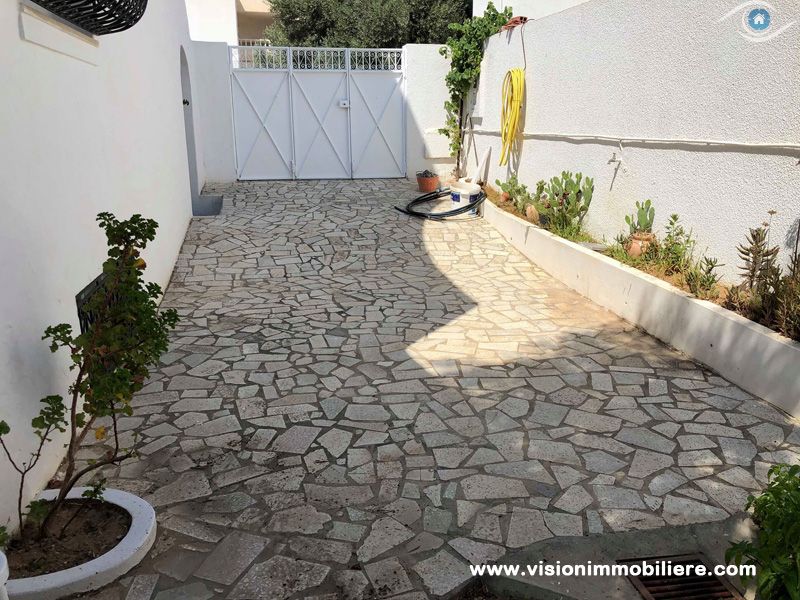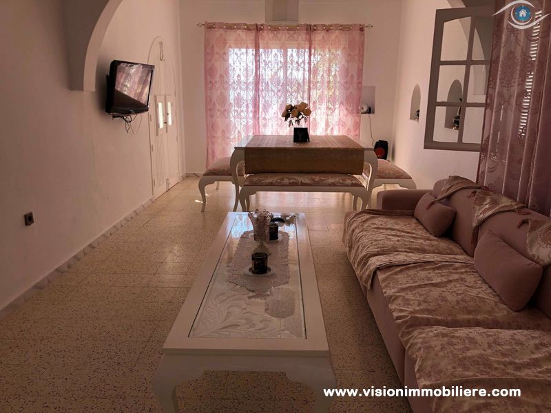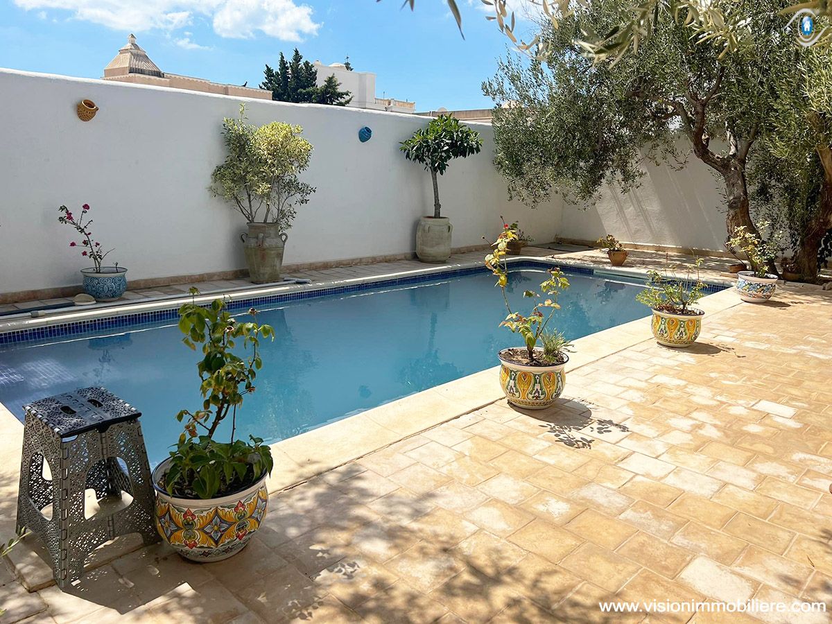 A vendre chez vision immobilière Hammamet-Tunisie ; une villa situé à Hammamet–Nord à 5 minutes de la mer. L’entrée donne sur un jardin et une piscine. La partie jour se compose d’un salon, un sale à manger, une cuisine aménagée et agencée par les éléments de rangement nécessaire, une salle d'eau et salle de bain commune complété la partie jour. La partie nuit dispose de 3 chambres à coucher meublées par dressings. La villa est entièrement équipée par un système de climatisations. Un abri et un garage qui peuvent contenir 2 voitures.