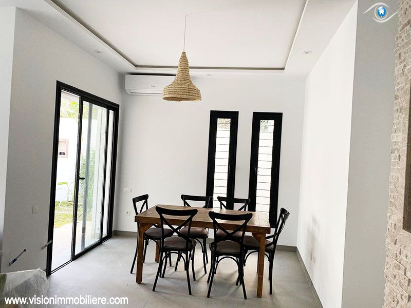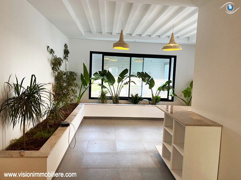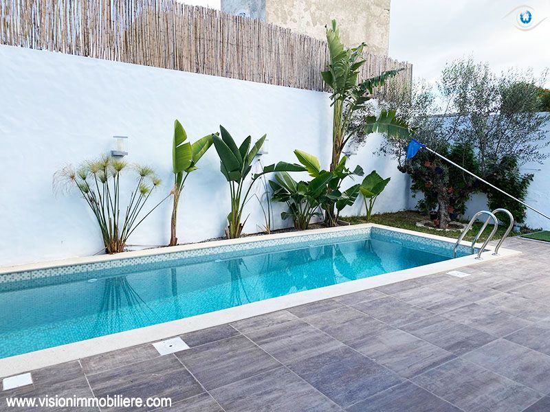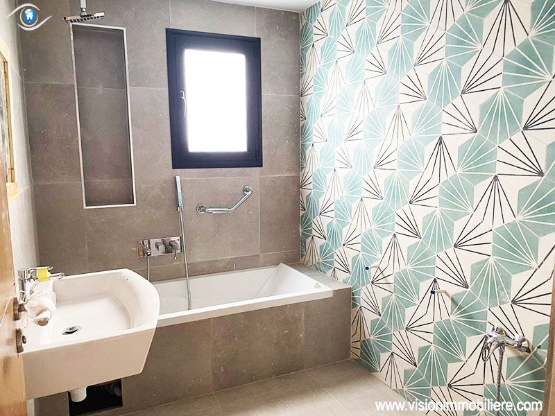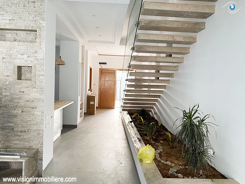 A vendre , Chez Agence Vision Immobiliére Tunisie Hammamet , cette villa au style moderne se situe à Hammamet-centre, elle est nouvellement construite . Une villa luxueuse avec une qualité de vie élevée ; L'entrée ouvre sur un grand jardin enveloppant paysagé et orné d'une piscine . La partie jour est composée d’un salon, un séjour, salle d’eau pour les invités et une cuisine moderne bien équipée de rangements fonctionnels. une suite parentale . Le 1er étage mène à la partie nuit qui dispose trois suites parentales meublées par des dressings , possédant un accès au vaste Terrasse avec une vue panoramique sur piscine. Elles partagent une salle de bain commune. La villa est entièrement équipée de chauffage central et de climatisations. Un abri qui peut contenir deux voitures.