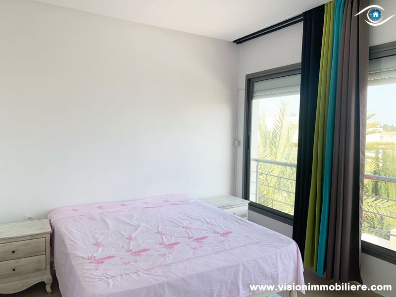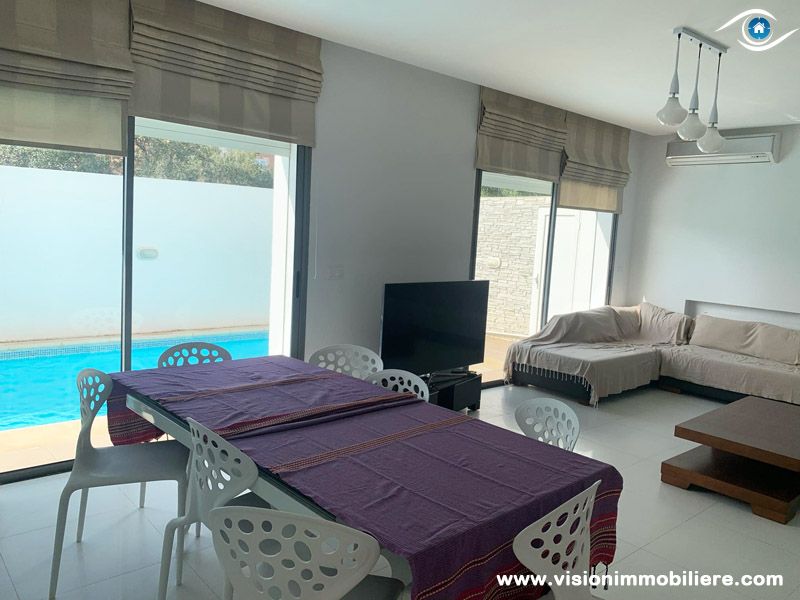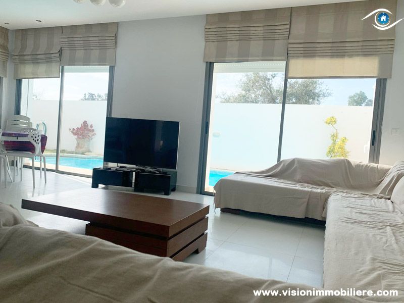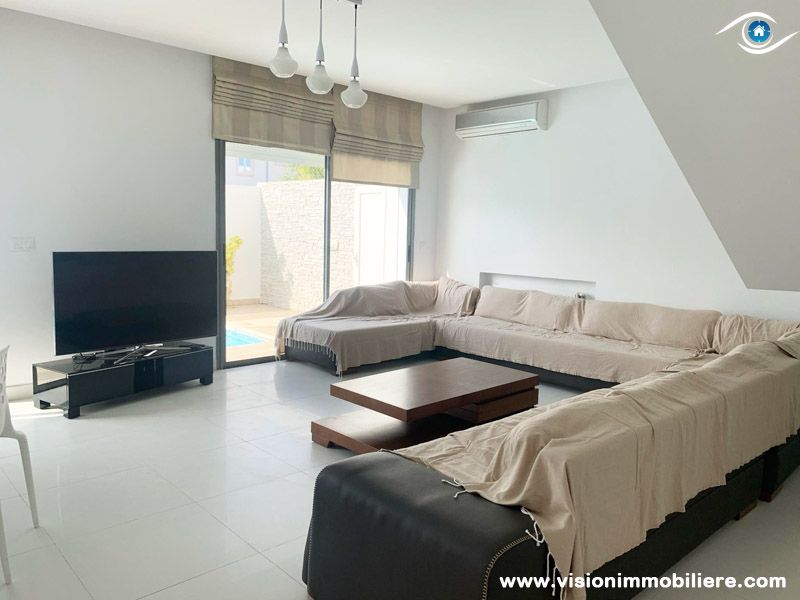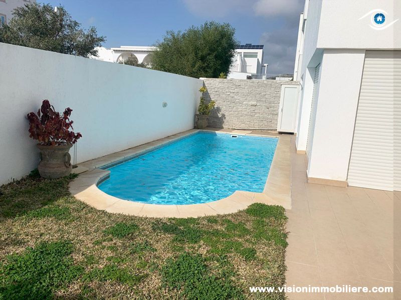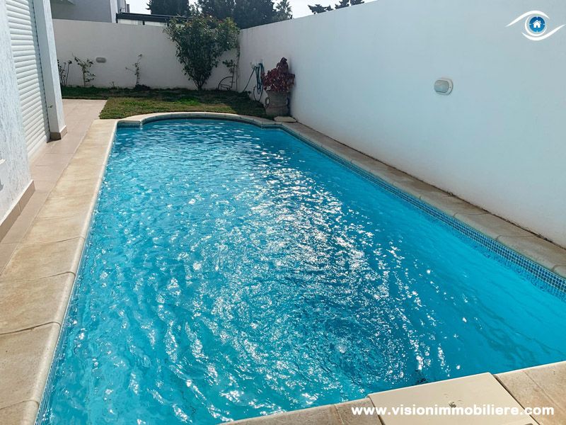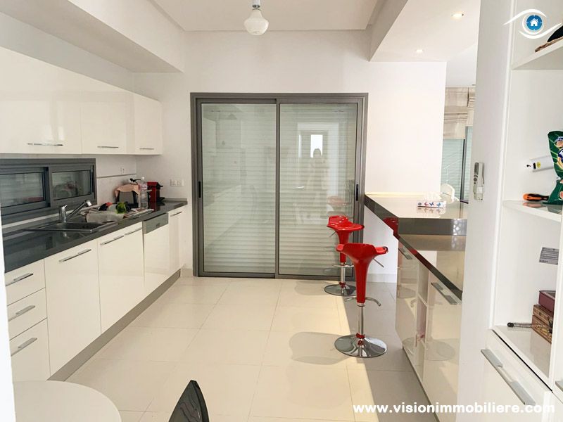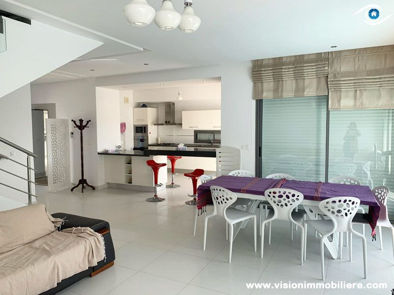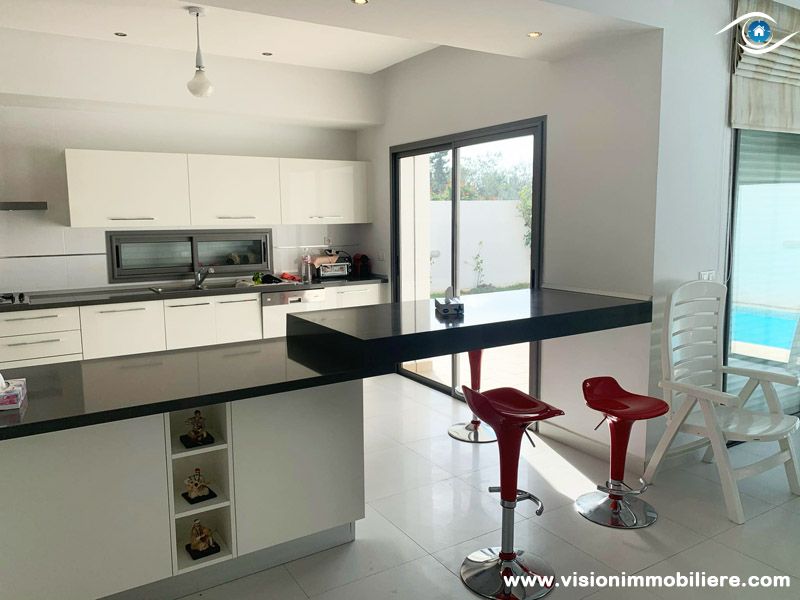 A Vendre , chez vision immobilière , Cette villa au style moderne se situe à Hammamet Centre . L'entrée ouvre sur un jardin enveloppant paysagé et orné d'une piscine . La partie jour est composée d’un salon spacieux et lumineux avec une salle à manger , un séjour, salle d’eau pour les invités et une cuisine moderne bien équipée de rangements fonctionnels. Le 1er étage mène à la partie nuit qui dispose quartes suites parentales meublées par des dressings et des salle d'eau , une chambre à coucher qui possède un accès au vaste Terrasse avec une vue panoramique sur piscine. La villa est entièrement équipée de chauffage central et de climatisations. un garage .