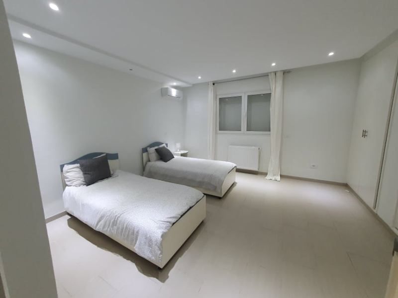 La villa est composée au rez de chaussée d’un grand salon, une suite pour les invités, une cuisine aménagée et équipée, une salle de bain et une chambre pour le personnel.