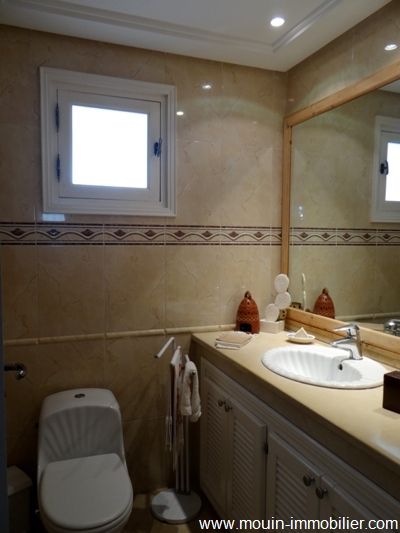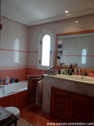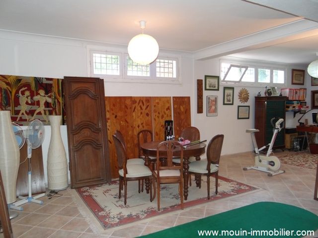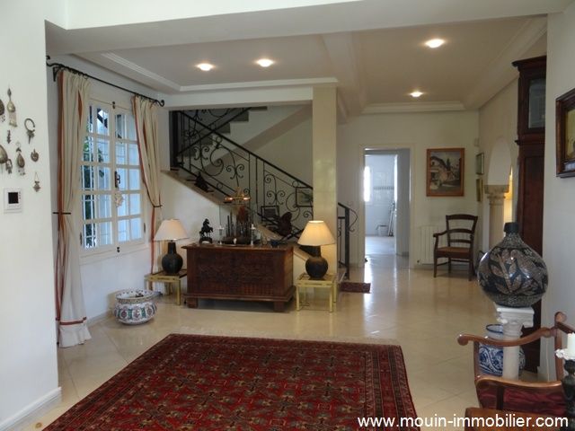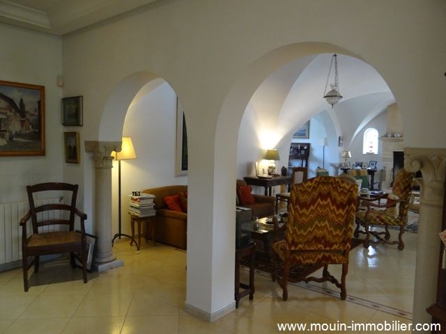 A vendre une somptueuse demeure érigée sur trois niveaux, bâtie au style arabo contemporain avec des voutes croisées et des arcades. Elle est située à Hammamet, dans un quartier verdoyant, calme et serein à 1km environ de la plage. La villa offre un spacieux salon contenant un agréable coin de détente face à la cheminé et une salle à manger, une chambre à coucher, une salle d’eau et une cuisine bien aménagée. Au premier étage, on trouve trois suites avec des placards et salles de bains et au deuxième une grande suite aménagée en une bibliothèque avec un coin bar et une salle d’eau. Au sous sol, on trouve une grande pièce, une spacieuse cuisine et un débarras. La villa est équipée de chauffage central et de climatisation et elle dispose d’une superbe piscine entourée d’un jardin gazonné avec arrosage automatique, d'une loge gardien et d’un garage pour deux voitures.