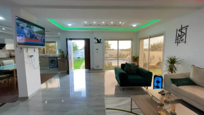 La villa se composée d’un hall d’entrée, un joli salon donnant sur le jardin et la piscine, une cuisine moderne bien équipée ouverte sur le salon, une suite parentale avec un dressing et une salle de bain, une chambre à coucher avec un dressing et une salle de bain avec une cabine de douche.