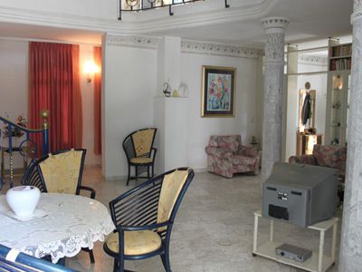 Villa unique grâce a sa belle architecture européen et arabesque, villa qui fait l’ongle proche de la mer (800m), bonne orientation, chapiteaux en marbre, sol revêtu en marbre, coupole centrale en pierre sculpté, piscine chauffée (accessible depuis l’intérieur+du jardin), abri pour 3voitures, fer forgé de sécurité, jardin gazonnée...