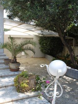 Extérieur : jardin gazonnée arboré et fleuri, studio indépendant pour invitée (salon, 1 chambre, cuisine, SE)