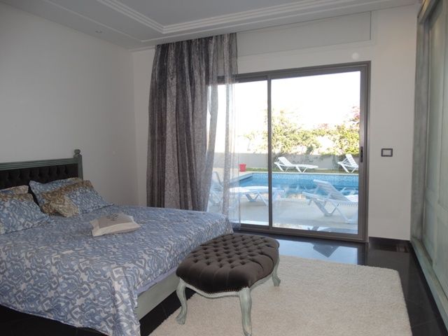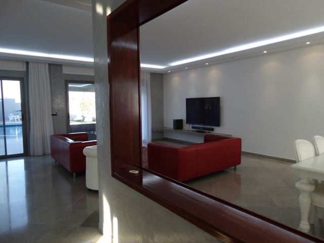 La villa comporte un grand salon avec des baies vitrées qui donnent sur la belle piscine, une cuisine américaine et moderne, une salle d'eau, deux salle de bain et quatre chambre à coucher qui donnent toutes sur la piscine.