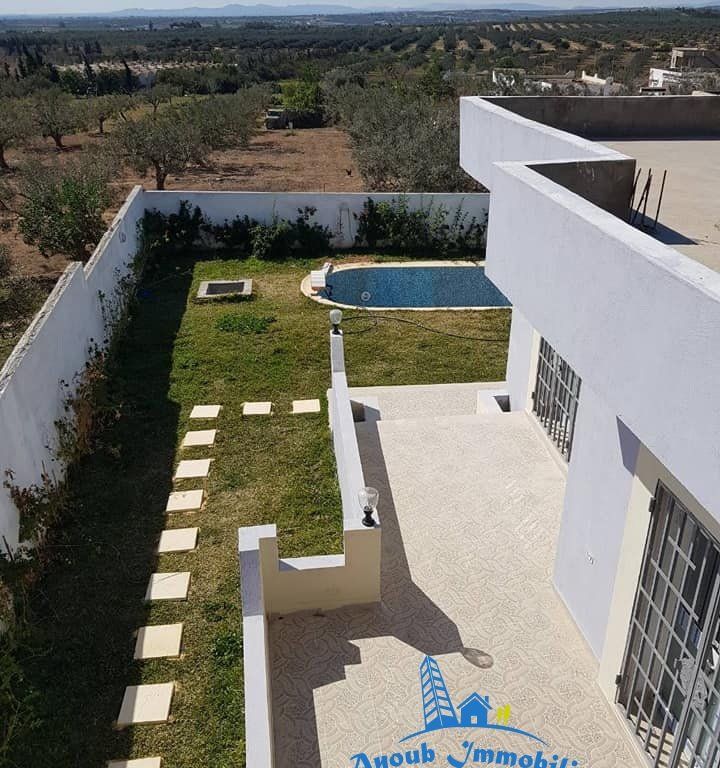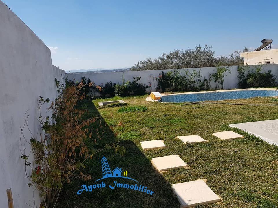 À ne pas rater, villa de plain pied à vendre à 7km de Yasmin Hammamet, zone Besbesiya, 640 m² de surface dont 200 m² couvert, S+3 dont une suite avec terrasse et placards, 3 salles de bain, un grand salon donnant sur un jardin, piscine, abri....