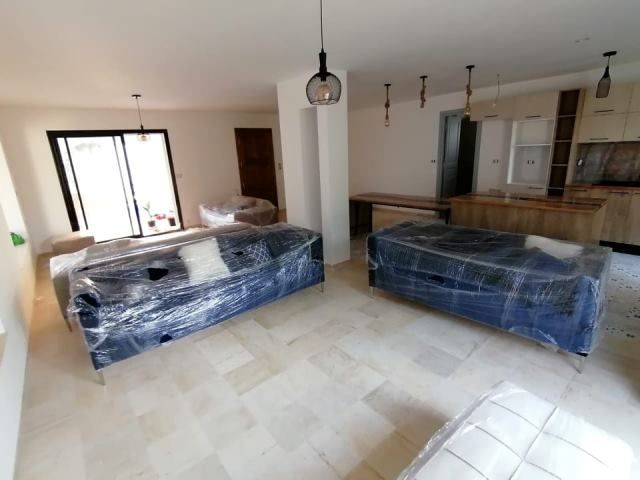 La villa est érigée deux niveaux, elle est composée au rez de chaussée d’un grand salon qui donne sur la piscine et le jardin, une cuisine moderne bien équipée et une salle d’eau d’invitées.