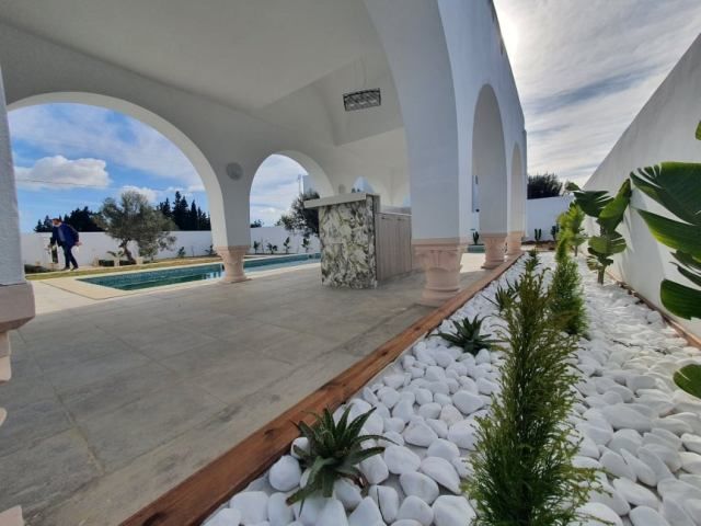 A vendre chez l'agence TPS Immobilière Hammamet, une superbe villa de très haut standing nouvellement construite avec des matériaux raffinés, bois noble, sanitaire de qualité, située à 8 km d'Hammamet et pas loin de la zone sidi hamamed, un mélange entre le style contemporain et traditionnel.