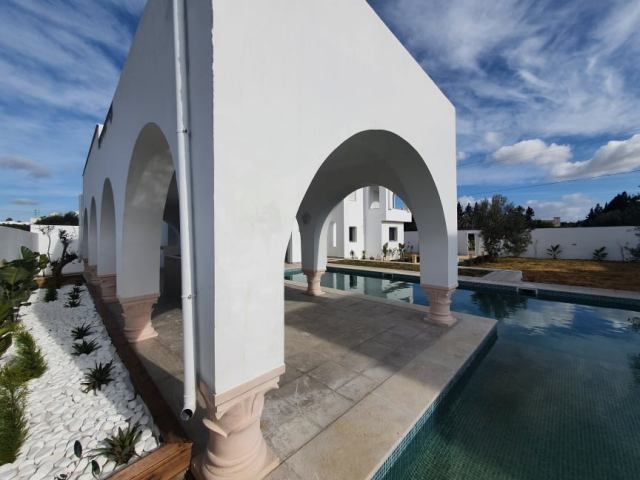 A vendre chez l'agence TPS Immobilière Hammamet, une superbe villa de très haut standing nouvellement construite avec des matériaux raffinés, bois noble, sanitaire de qualité, située à 8 km d'Hammamet et pas loin de la zone sidi hammed, un mélange entre le style contemporain et traditionnel.