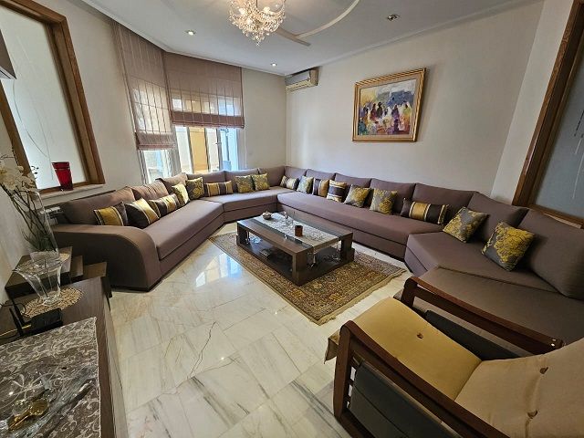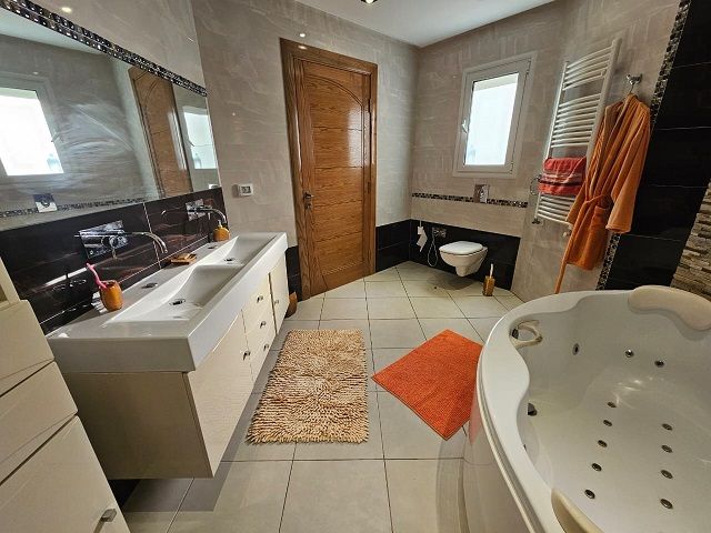 Cette majestueuse villa avec des belles prestations (marbre blanc, boiserie noble, PVC double vitrage…) s’étend sur un terrain dans les 1000 m ² avec 750 m ² de bâtie, est élevée sur trois niveaux.