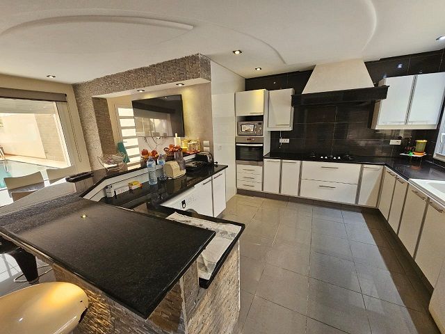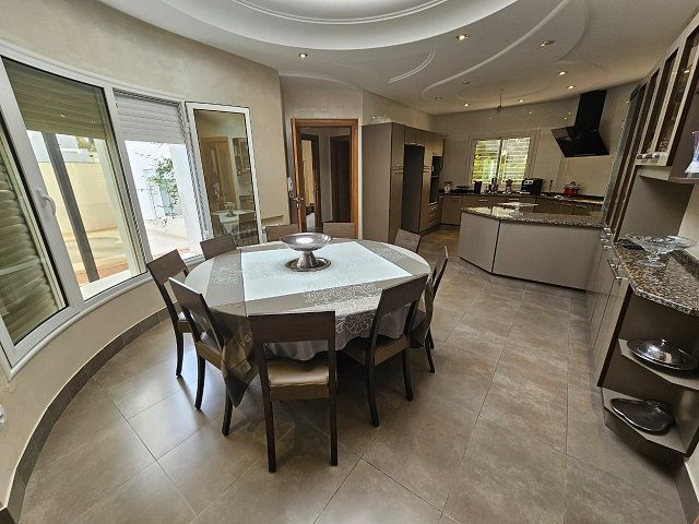 Un rez de chaussée qui dispose, un vaste hall, un agréable séjour lumineux, une suite parentale avec sa salle de bain privée, un très grand salon-salle à manger décoré avec toit en plâtre tout donnant sur une belle piscine et un verdoyant jardin.