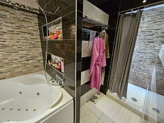 De plus , ce rez de chaussée est complété par une cuisine américaine indépendante entièrement équipée avec un coin de table à manger, une salle d’eau pour les invités, un cellier et une deuxième cuisine toute fonctionnelle bien aménagée avec mezzanine.