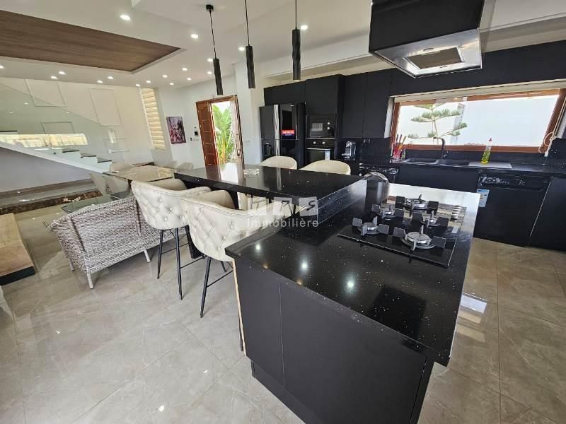 Cette demeure avec son architecture d’intérieure très moderne, au rez de chaussée elle dévoile une cuisine désignée sur mesure avec ilot central en marbre noir. Cette belle cuisine s’ouvre sur une sublime pièce de vie baignée de lumière.