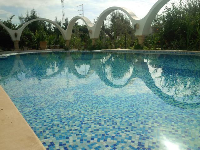 A vendre chez l'agence TPS Immobilière Hammamet, une belle villa de plain-pied avec une piscine non meublée ayant le style arabesque avec des arcades et voutes qui s’y mélangent pour le beau plaisir des yeux, elle est bien située au cœur des vergers mystérieux d’Hammamet, un endroit calme et serein et bien accessible vers la route de Bir Bouregba.