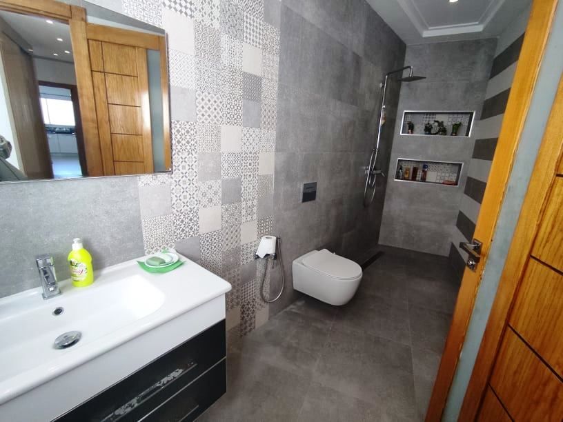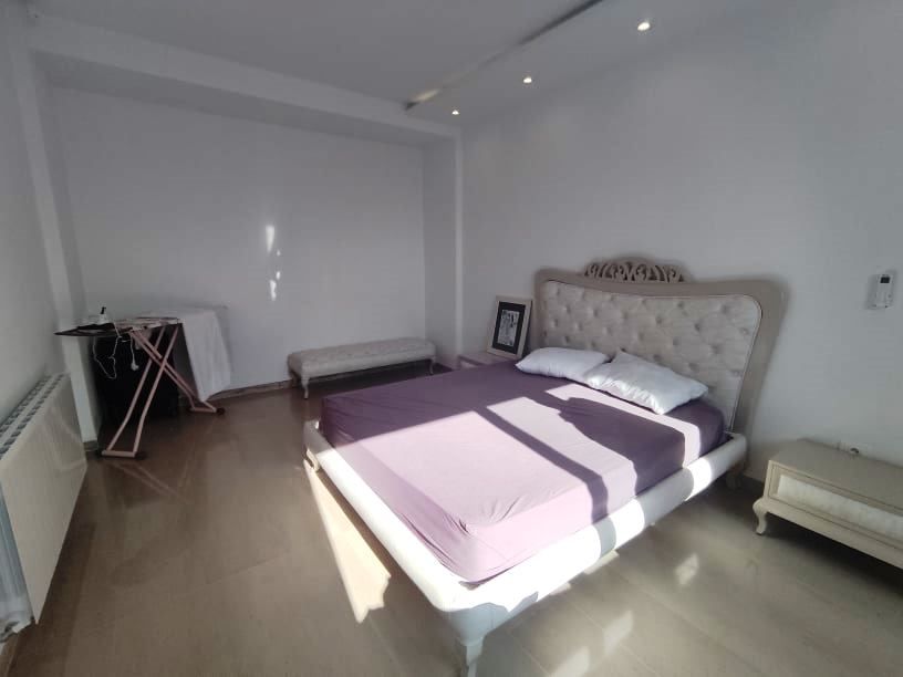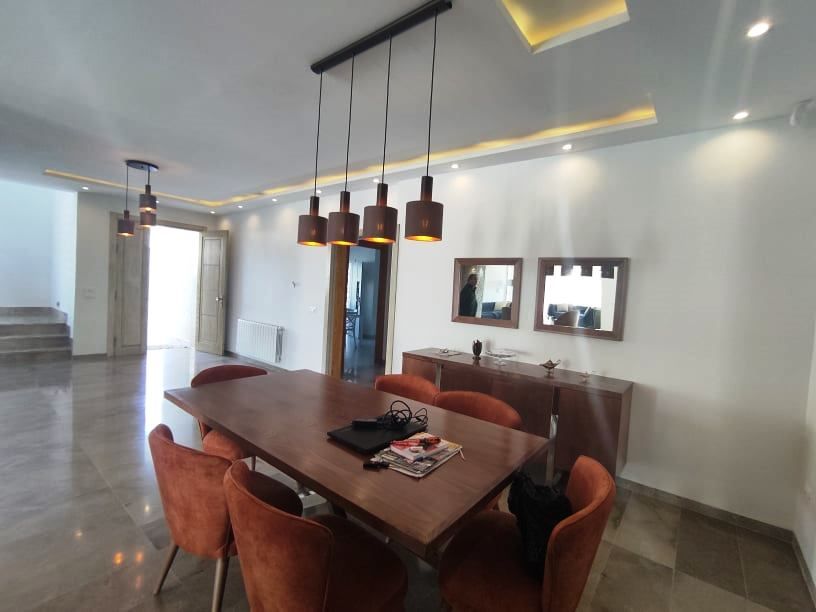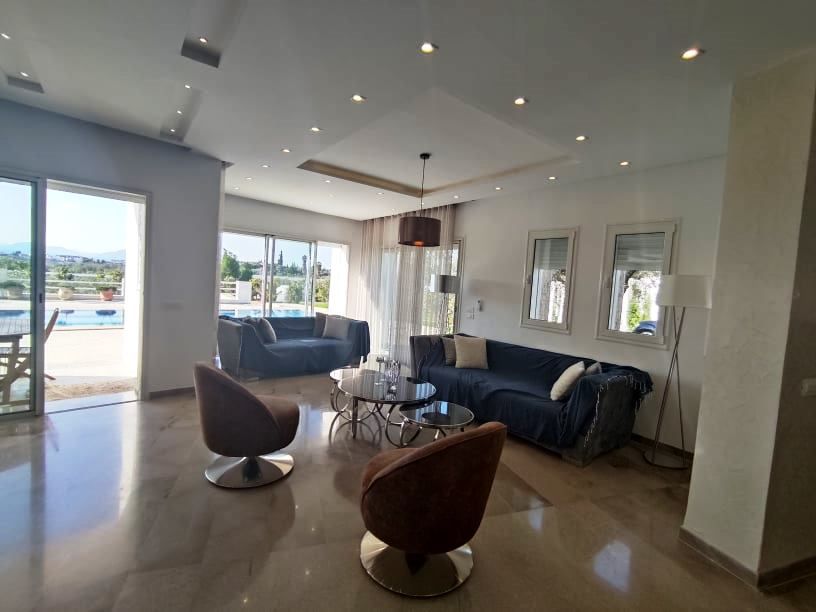 Quant à l’étage, il comporte un salon, une suite parentale, deux chambres à coucher avec une salle de bain commune, tout l’étage bénéficie aussi d’une grande terrasse avec une imprenable vue sur le golf d’Hammamet.