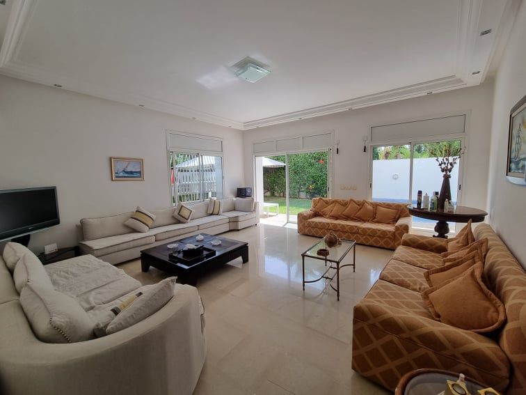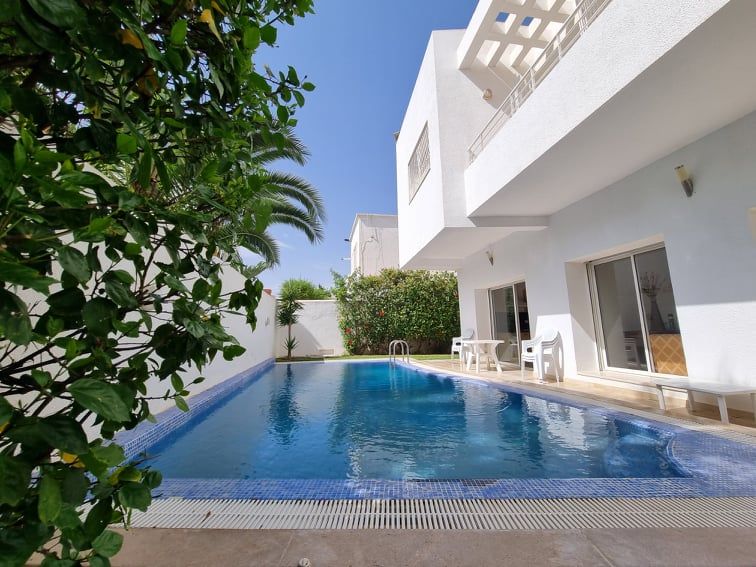 A vendre chez l'agence TPS Immobilière Hammamet, une belle villa avec piscine construite sur trois niveaux, très bien située dans une résidence gardée à Yasmine Hammamet.