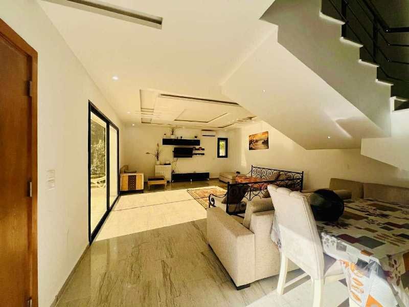 Le rez de chaussée se compose d’un salon donnant sur la piscine, une cuisine moderne bien équipée, une chambre à coucher et une salle d’eau d’invités.