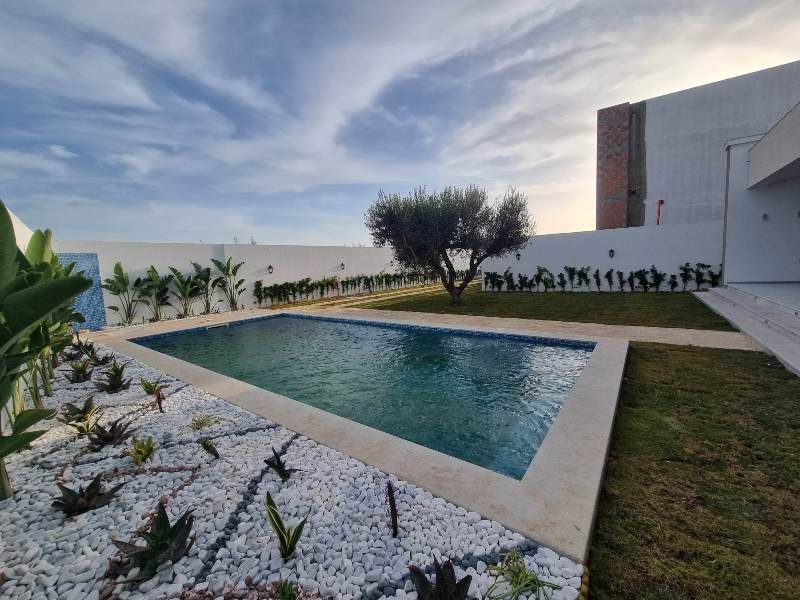 Agence TPS Immobilière Hammamet vous propose pour la vente une belle villa avec piscine toute neuve située dans un quartier calme seulement à 3 mn de Yasmine-Hammamet.