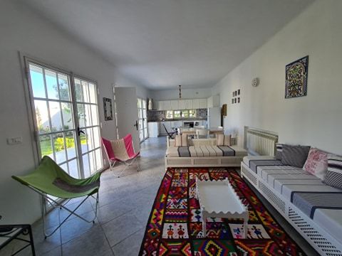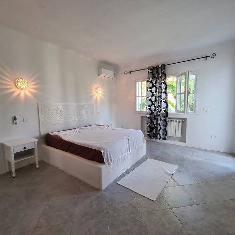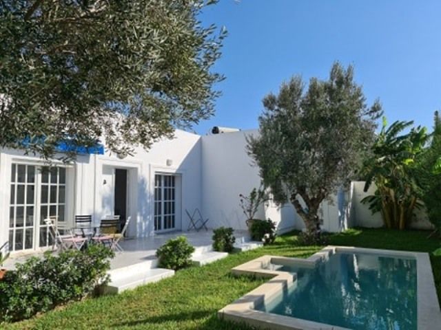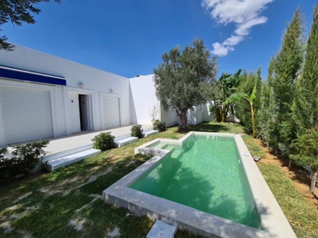 A louer à l'année chez l'agence TPS Immobilière Hammamet, une villa avec piscine de plain pied d’une belle architecture arabesque modernisée, située à Hammamet face à Hôtel Ribat dans un quartier calme et résidentiel. Elle offre une grande pièce composée d’un salon-salle à manger, une cuisine américaine installée, une chambre à coucher, une suite parentale et une salle d’eau. La propriété est équipée de chauffage central et elle dispose d’un beau jardin clôturé et d’un studio indépendant.