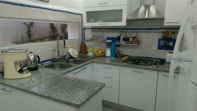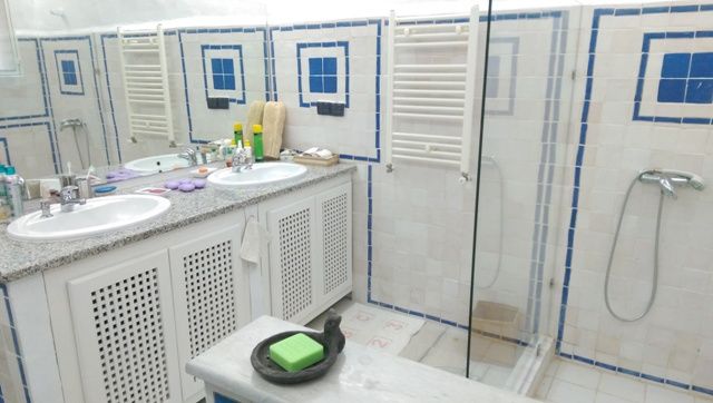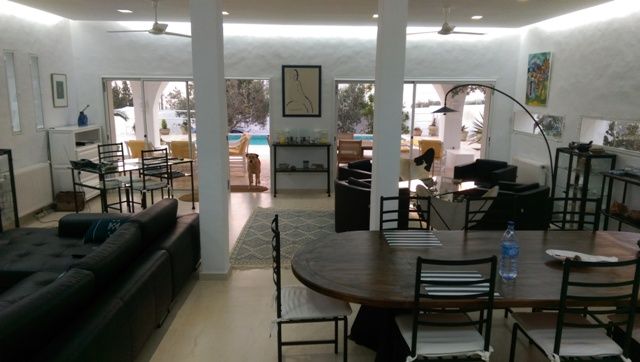 La villa est érigée sur deux niveaux, elle comporte au rez de chaussée, un grand salon-salle à manger qui sonne sur la belle piscine débordante, un hall d'entrée, deux chambres à coucher de style mauresque avec une salle de bain commune, une cuisine moderne et bien équipée et une salle d'eau d'invités.