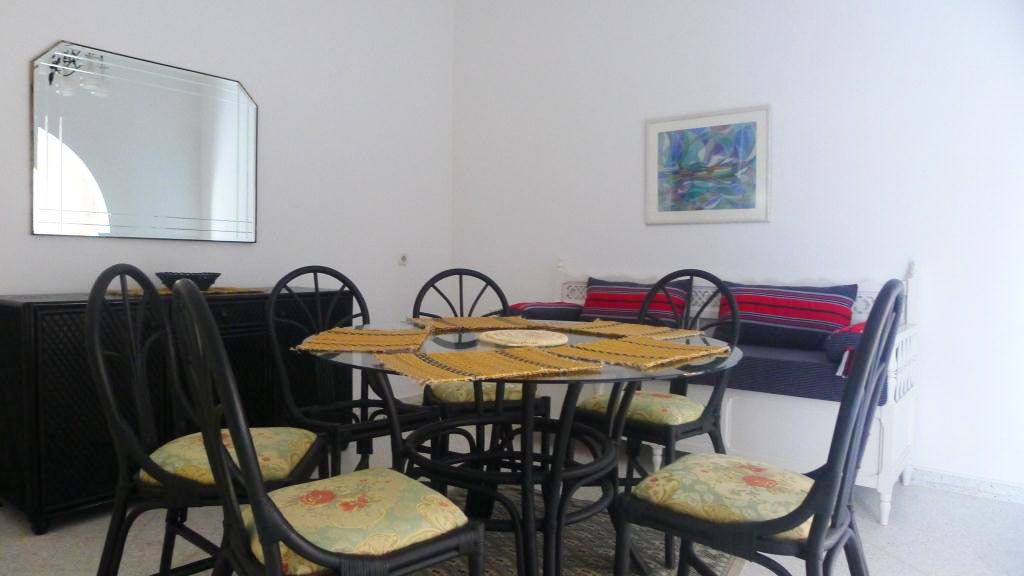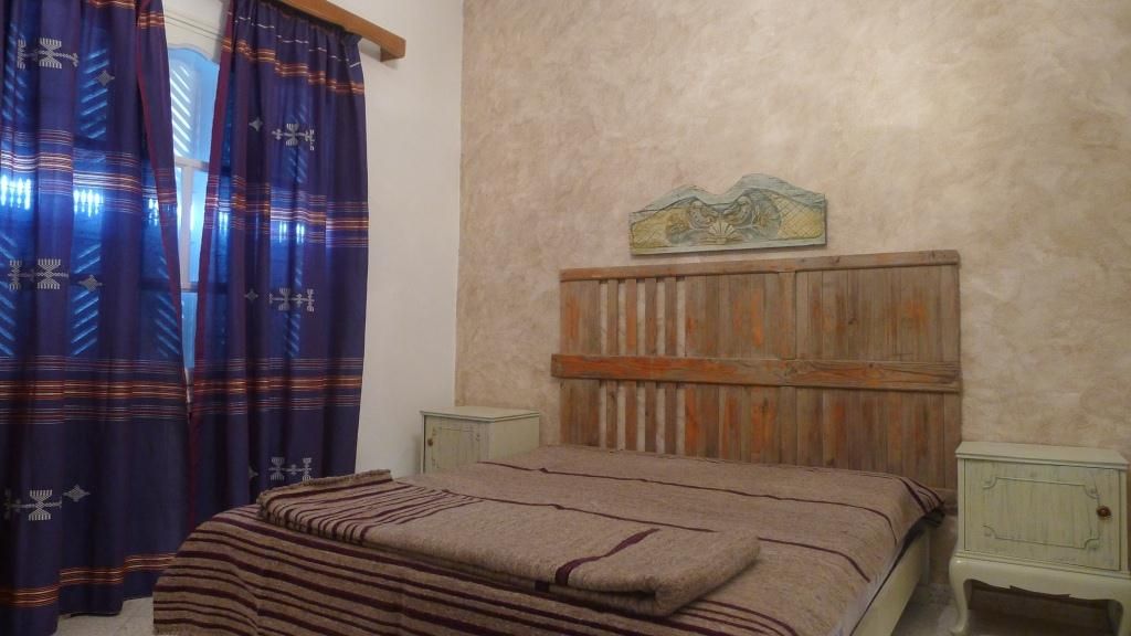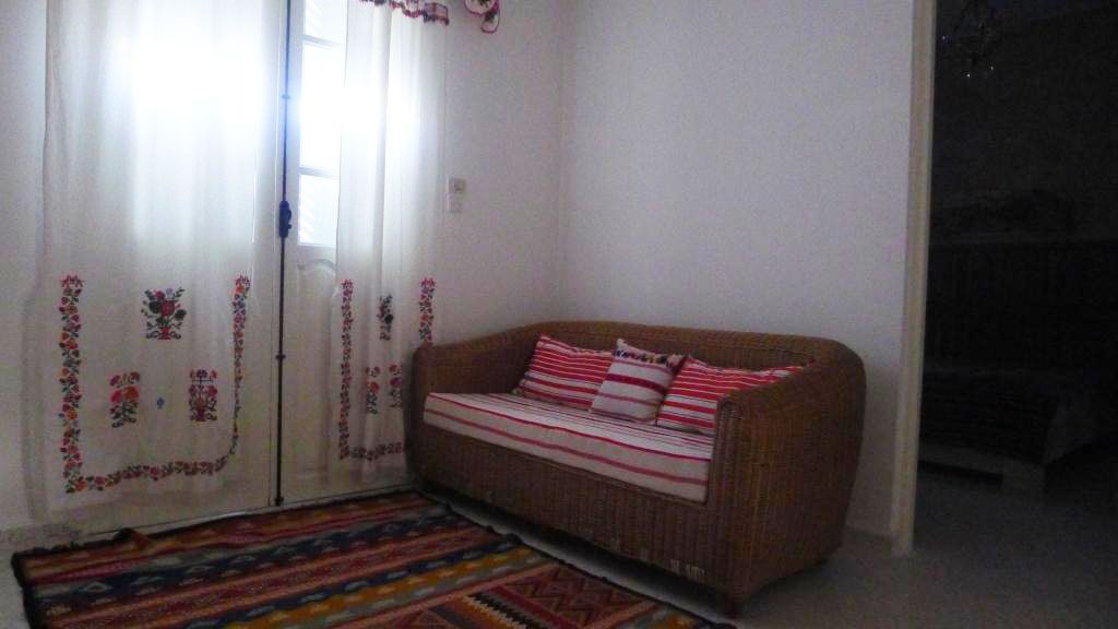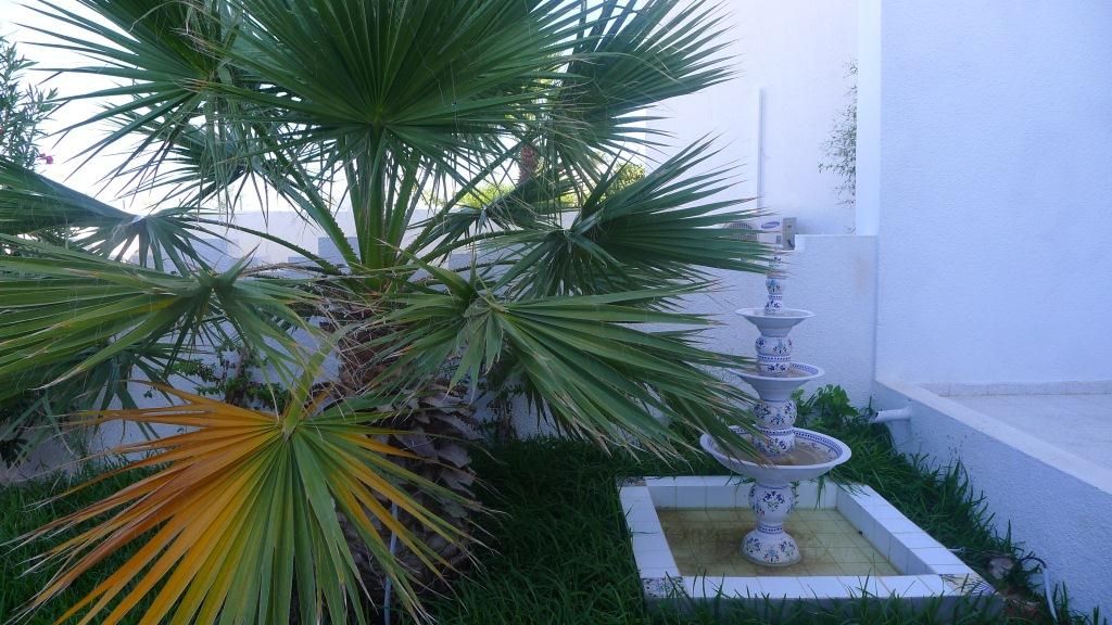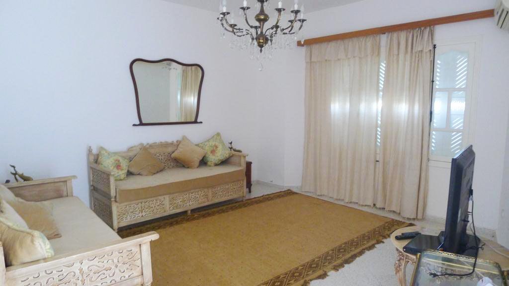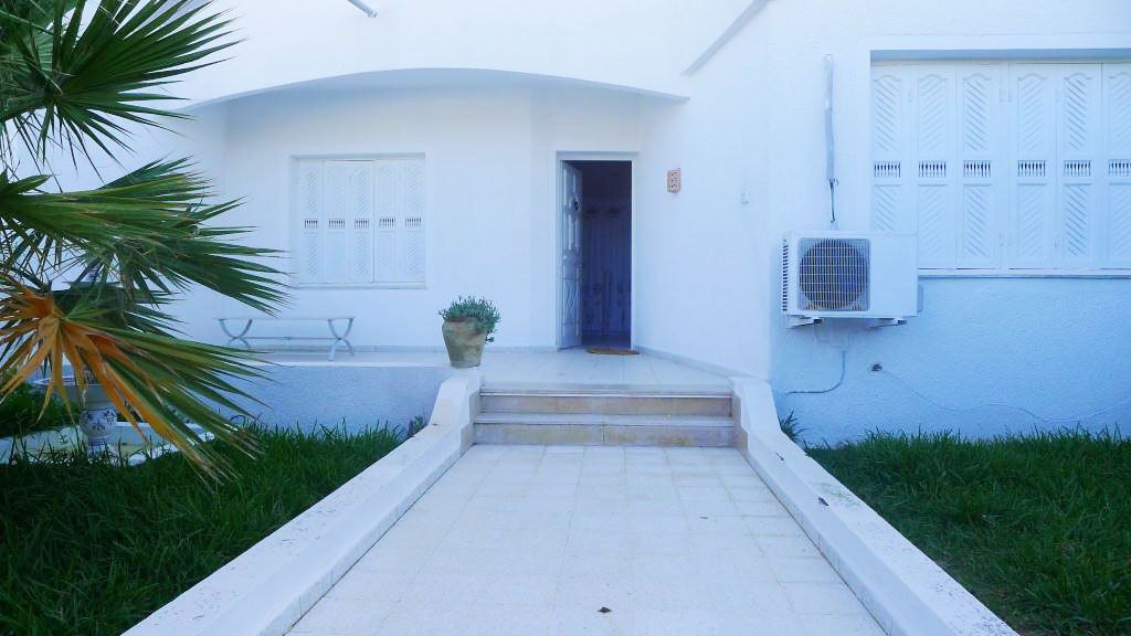 Cette villa est située dans un quartier calme et résidentiel, proche de Golf Djerba. L'entrée donne sur un salon soigneusement meublé et un séjour complété par un coin repas de six places. Une salle d’eau est disponible. L’étage est desservi par un escalier tapissé en marbre, il comprend un coin séjour et deux chambres à coucher équipée chacune d'un lit double. Une salle de bain avec baignoire est commune. Une terrasse à l'entrée de villa est aménagée.