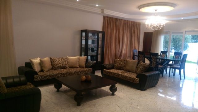 La villa est composée au rez de chaussée d’un grand salon qui donne sur la piscine, la terrasse et le jardin, aussi on trouve une chambre à coucher, une salle d’eau d’invitée et une cuisine indépendante et qui s’ouvre sur l'extérieur.