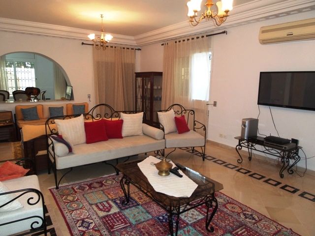 A louer pour les vacances chez TPS immobilière Hammamet,une belle villa de standing avec un joli jardin et une piscine avec cascade. La villa érigée sur deux niveaux, elle se compose au rez d'un double salon, une salle à manger, une salle d'eau, un belle cuisine et une jardin d'hivers. A l'étage, trois chambres à coucher, une salle de bain et un terrasse. A extérieure, une belle piscine, une cuisine extérieure et un abri de voiture. La villa est équipée de chauffage central et de climatiseurs dans toutes les pièces.