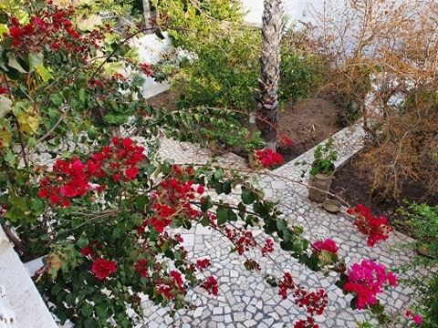 Une jolie terrasse avec vue sur mer avec des arcades concevant le charme typique de maisons d’Hammamet avec des jolies plantes tout autour de la maison.