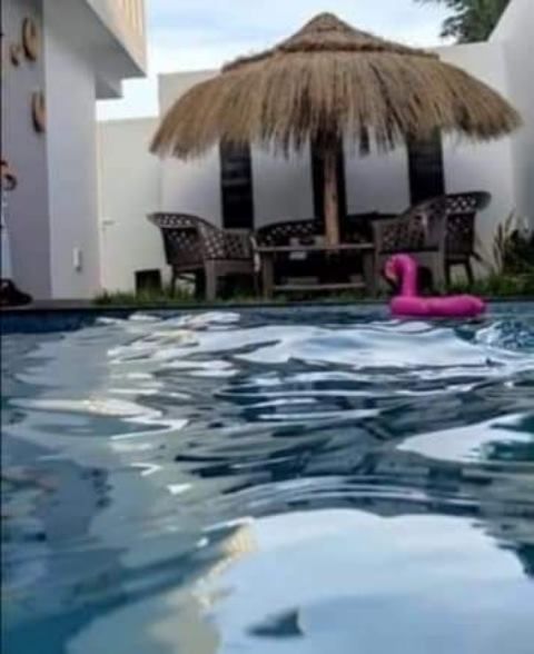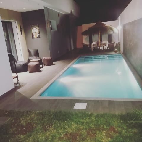 La villa est érigée sur deux niveaux et elle comporte un salon avec des baies vitrées qui donne sur la piscine et le jardin, deux suites parentale, deux chambres à coucher, une salle de bain commune, une salle d’eau d’invitées et une cuisine moderne et bien équipée.